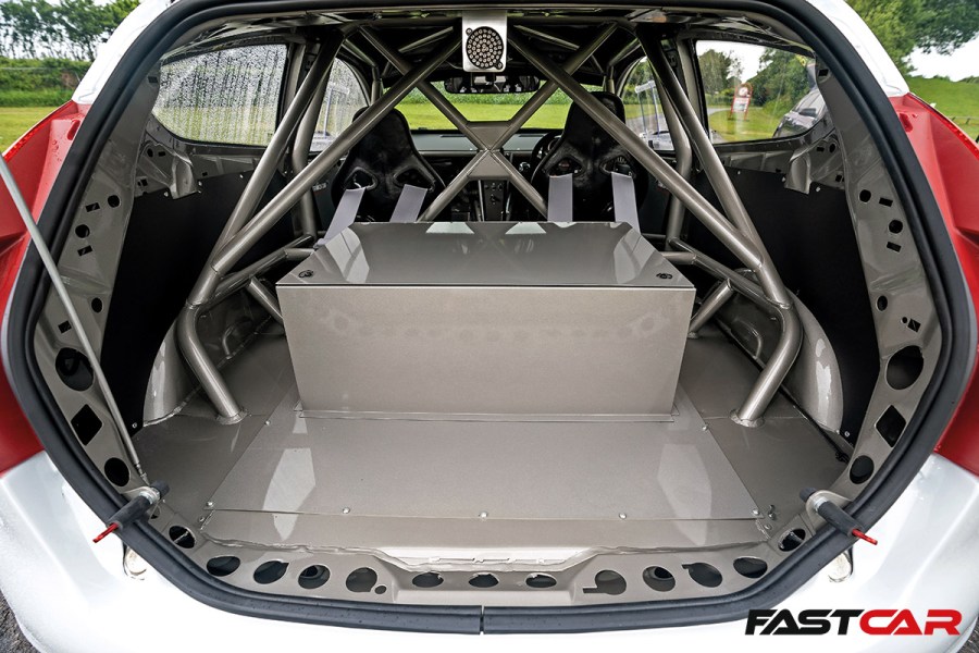 Behind the wheel sits an AIM Solo 2 GPS speedometer and lap timer, fitted into a custom carbon housing. Beneath the wheel there’s an OBP pedal box – a work of art in itself. Open the tailgate and there’s a neat box, which contains the fuel cell – again, all really well thought-out and perfectly executed.
