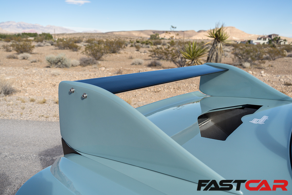 The exhaust manifold, exhaust, screamer pipe and intercooler piping were all fabricated by hand from titanium and the the exhaust and turbo have been ceramic-coated. You might also have noticed that there’s no rad in the engine; cast your eyes to the rear of the car and that’s where you’ll spy the cut out in the boot lid that feeds air to the boot-mounted radiator, with all the pipework for this having also been fabricated by hand from titanium. An incredible amount of incredible work has gone into this engine and engine bay and it’s all just, well, incredible really.