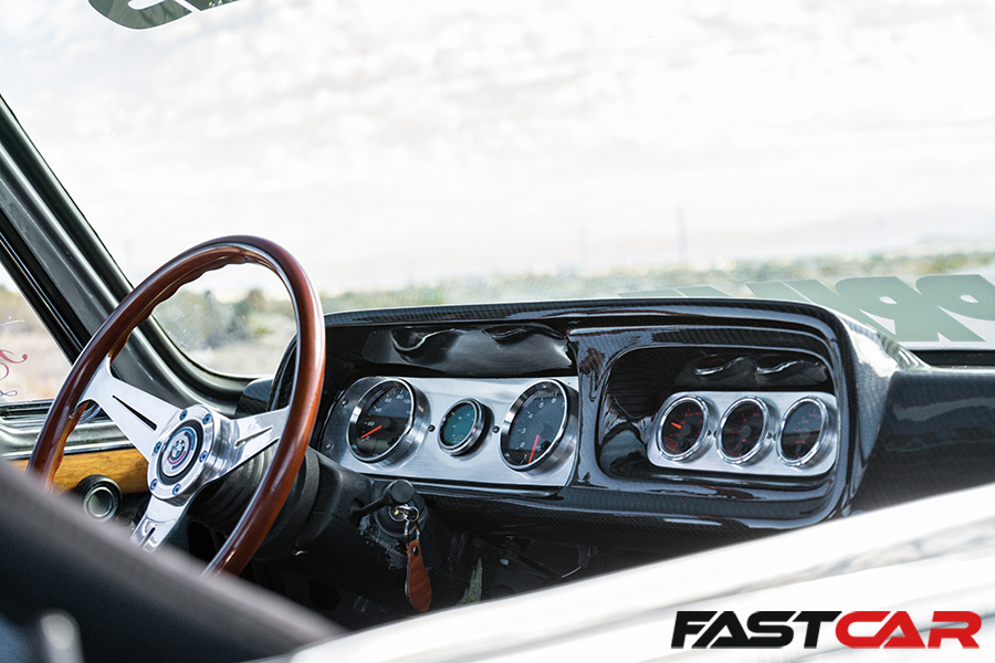 Carbon single-piece bucket seats with M tricolor stitching, vintage Nardi wooden steering wheel, custom Nostalgic Grains gear knob, custom carbon dash, custom Speedhut gauges for oil temperature, water temperature and boost pressure, AEM AFR gauge