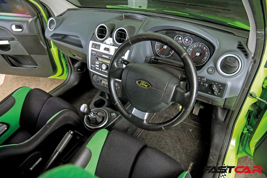 Ben built this modified Mk6 Fiesta to fulfil a dream, and he intends to use it to the fullest. After letting a few Ford icons slip through his fingers, this one isn’t going anywhere – and it has to be usable. That’s why the front half of the cabin sports pretty much a full factory interior in addition to those floor-mounted buckets. He’s going to be driving this on the road, either to shows or to the track, and it’s noisy enough as it is so he’s allowed himself a bit of carpet. It’s handy to have a stereo and a heater too, that’s not a compromise. That’s just good sense.