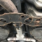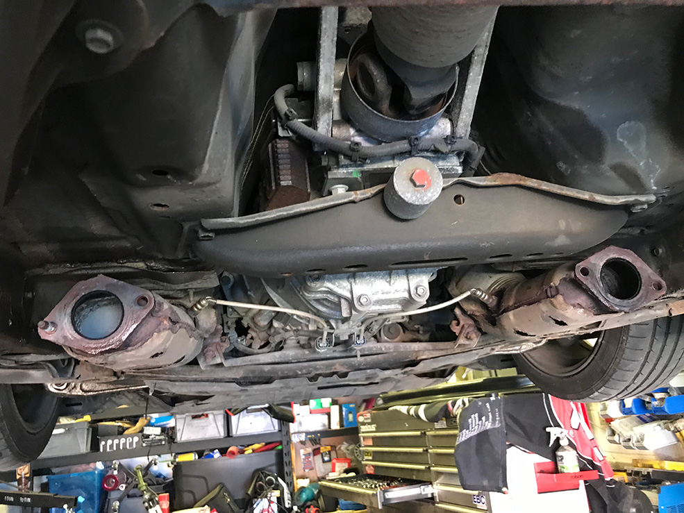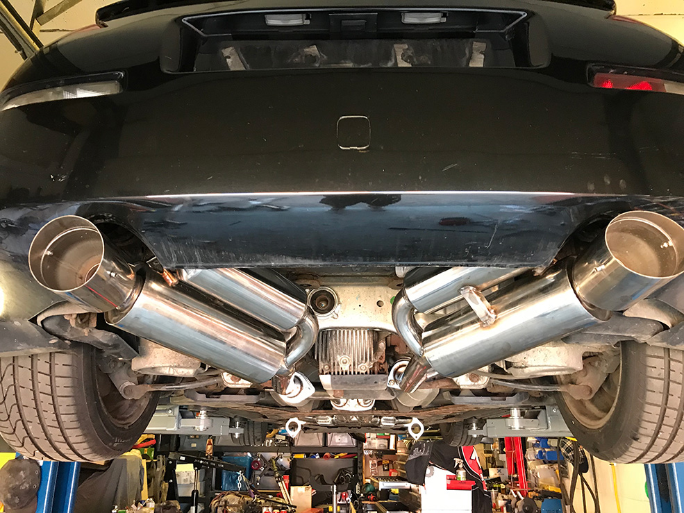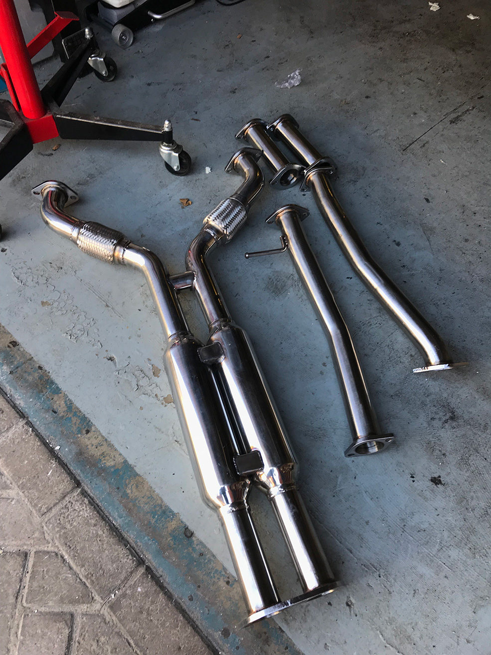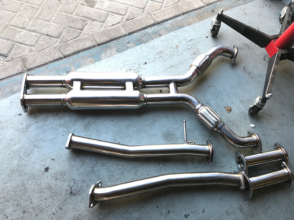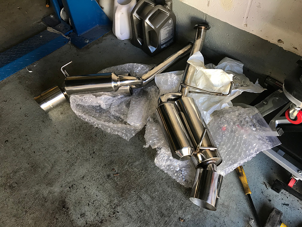 As you can see from the pictures, the design of this thing is a little off-the-wall, but it’s easily one of the best-looking systems out there. What’s also nice is that they include the extra pipe extensions to make it fit the V35 Skyline… so don’t panic as much as I did if you’re slapping one on a 350Z and there’s a couple of bits left over. Anyway, this system also includes the all-important Y-pipe which replaces the restrictive (and prone-to-rust) factory item. What’s more, once I’d removed the rusty nuts on the original by ranting and raving at them with plenty of blue language (you mean using your angle grinder right Midge? – Jules), the actual system was an absolute doddle to fit.