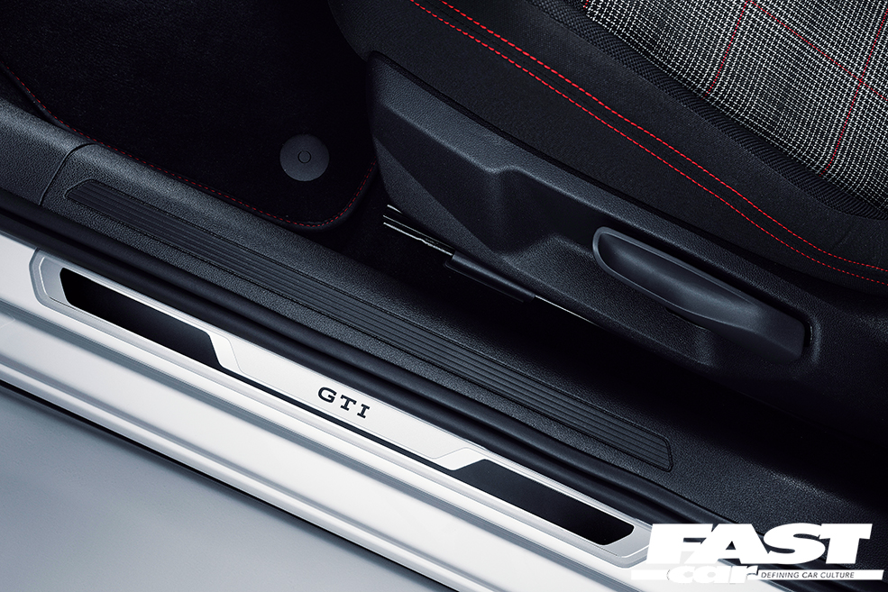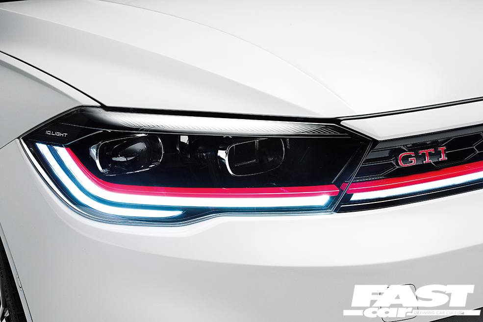 Special styling features include GTI-specific bumpers, a red GTI grille badge, red-painted brake callipers, honeycomb air intake grilles, and the red trim above the LED daytime running lights strip. Standard features are the IQ.LIGHT LED matrix headlights, and an illuminated radiator grille crossbar to complement the daytime running lights, while the LED tail lights, extending towards the middle of the tailgate, now feature the dynamic indicators which sweep outwards in the direction of turn.