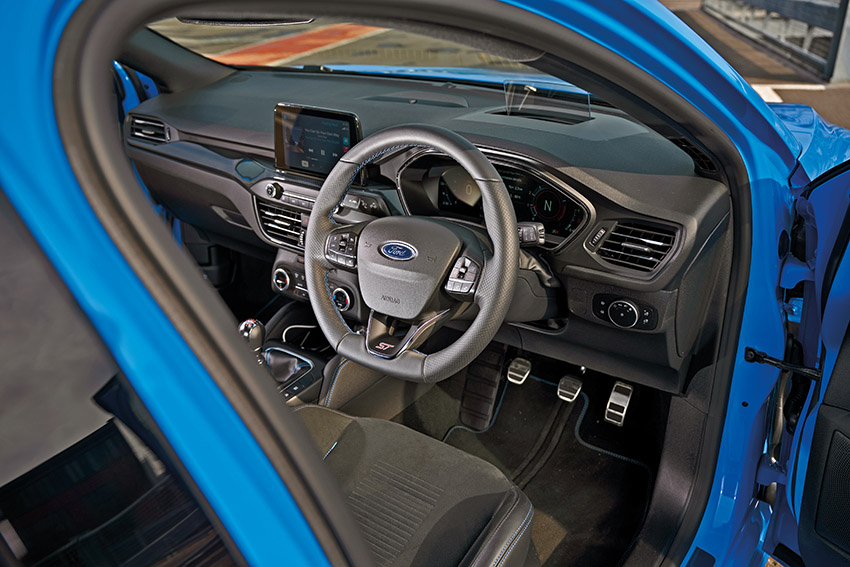 Externally, the Ford Focus ST Edition is distinguished by its Azure Blue paint, which, as with the Fiesta, isn’t available on the cooking models. The blue is complimented by a black roof, gloss black trim and 19in lightweight flow-formed wheels, which help reduce unsprung mass and assist with the lively and alert driving experience. Some will lament that it’s not a little more aggressive visually, but those in the know will know, and that’s arguably cooler.