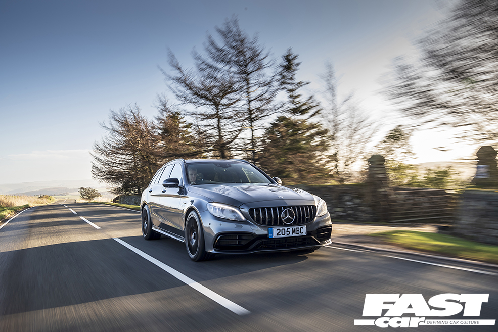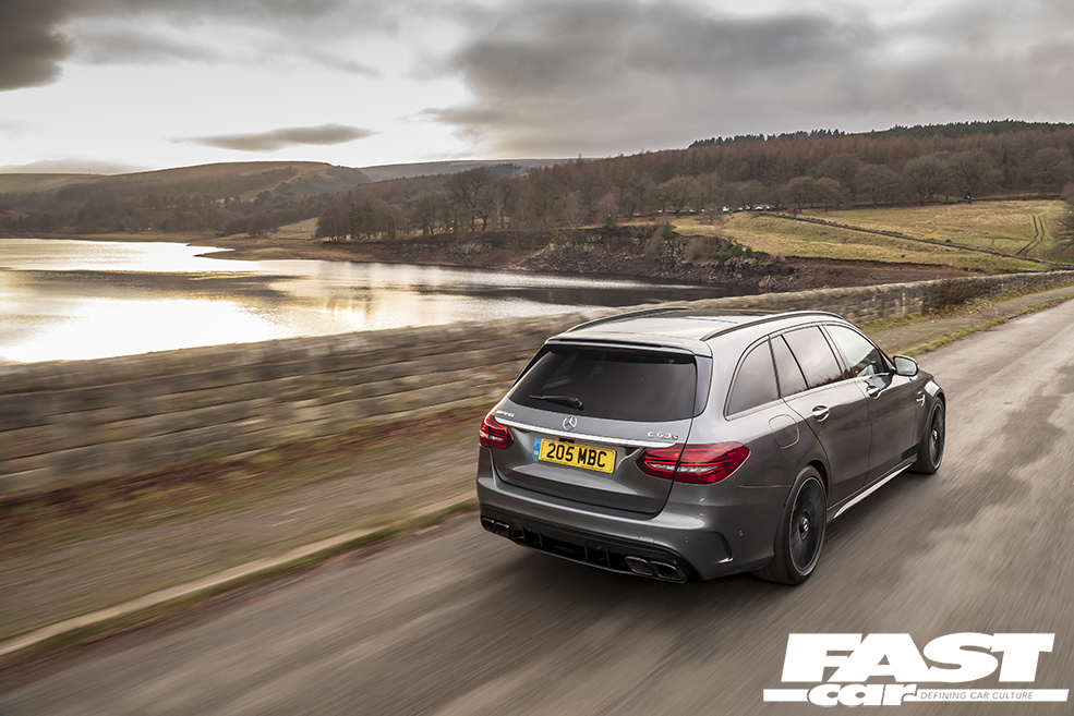 The only option you get when it comes to gearboxes is a 9-speed MCT. It’s a dual-clutch gearbox developed and made by Mercedes, with paddles attached to the steering wheel. Normally I would complain about the lack of a manual, but here, in an estate (remember!) this is the perfect combo. You aren’t going to be heeling-and-toeing with the family on board, nor would you particularly want to. The dual clutch system is too good not to want it. The gearshifts are eye-wateringly fast and offer their own theatrical production, with rasps and farts on application. It’s also nice to keep downshifting unnecessarily to get those overrun burbles. While inevitably they’re engineered, it’s far more acceptable to have overrun burbles on a thumping great twin-turbo V8 with over 500 horses, rather than your Ford Fiesta, if you catch my drift.