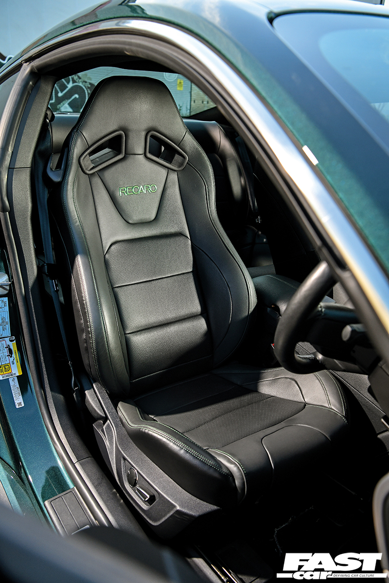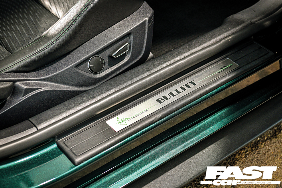 Bullitt Edition Ebony leather Recaros with green stitching, Steve McQueen Edition illuminated door sill plates, Steve McQueen Edition dashboard serial plates