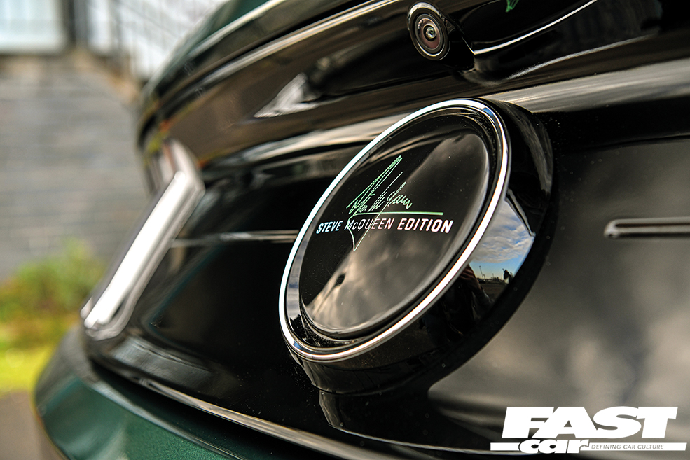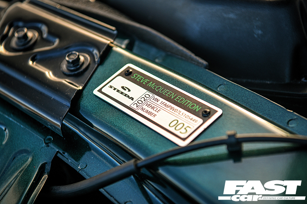 Bullitt Edition Dark Highland Green paint, Steeda Q-Series front fascia, Steeda bonnet struts, Steve McQueen Edition engine compartment serial plates, boot emblem, Steve McQueen Edition special thank you package (letter of authenticity, engraved key fobs, signed and numbered Chad McQueen poster, signed and numbered archival pigment print by Camilo Pardo)