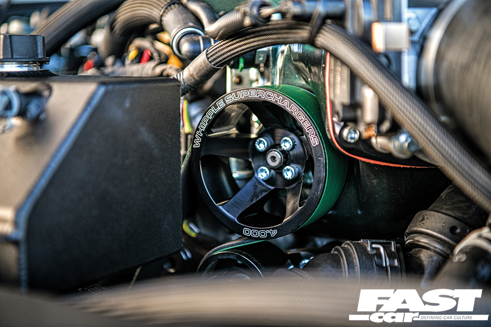 Those high loads come courtesy of a Whipple supercharger conversion, which nestles between each cylinder bank of the 5.0-litre Coyote V8, drawing in almost three litres of atmosphere with every rotation of its twin screws.