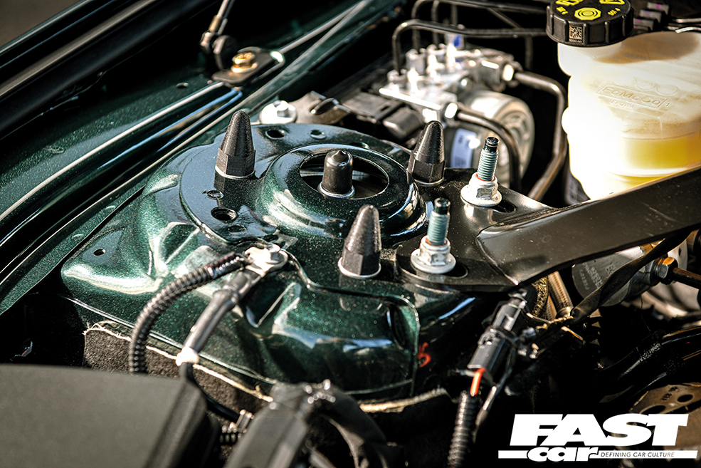 Notable mentions in that regard should also go to the wealth of uprated chassis parts installed out of sight. The original independent rear suspension setup is secured and aligned with Steeda’s IRS support package, while Ford Performance ‘severe-duty’ halfshafts emerge from the differential to send rubber-vaporising torque to each wheel. Also improving rear-end feel are uprated and flex-proof vertical links, while Steeda anti-roll bars are installed across both axles and secured to the body with billet mounts to keep body roll to a minimum.