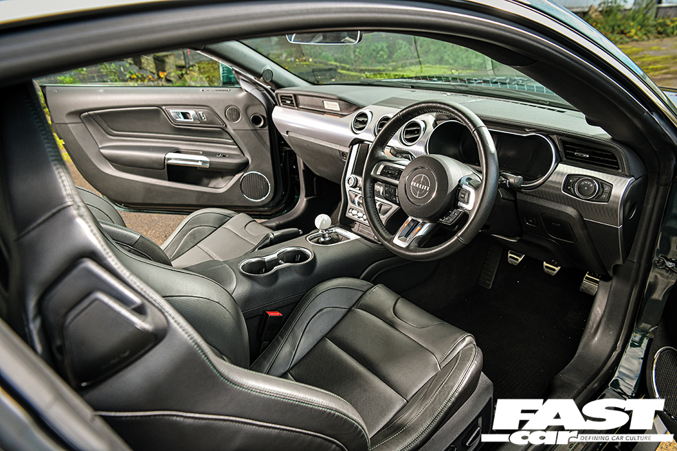 When paired with Steeda’s MagneRide dual-rate competition springs, this baseline lowering hunkers the car down beautifully over one of the car’s key aesthetic cues – an outstanding modern interpretation of the classic American Racing Torq Thrust mag wheels. Gently staggered in width from front to rear, these 20in Steve McQueen Edition monsters dwarf the 15in originals but provide the larger footprint needed to keep the 720bhp-plus motor on the (relatively) straight and narrow.