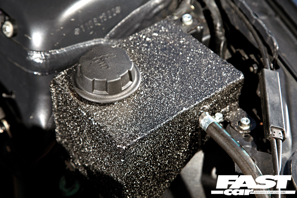 You might well be wondering how on earth Kevin can even attempt to put down 980whp through 225 section rubber. The answer is he can’t, which is where the set of 15” Style 10s equipped with Mickey Thompson ET Drag slicks comes in. The sidewalls say 26.0/10.0, and this means the tyres have a 26” diameter and are 10” – 254mm – wide and they make putting all that power down a whole lot easier. With those mounted, the sleeper look is lost a little, but then Kevin doesn’t use them all the time plus they’re not for show and are really a necessity, so that makes things a bit different.