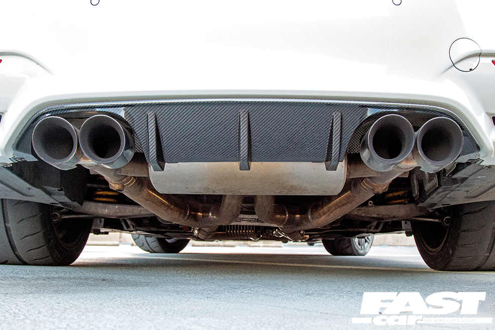 Now, while Ricky did have some mods in mind for his M4, with this being his first BMW and with him never having modded a car before it’s understandable that he fully intended to take things easy and keep the mods mild. “My only plans I had for the car after purchasing it were to add an exhaust and downpipes, the simple bolt-on mods,” he says, and we can see how well that worked out for him… “The first mod done to the car was adding catless downpipes and an exhaust. Both were purchased from Fabspeed as they have their signature X-pipe design to eliminate the rasp of the OEM exhaust note,” he says. “The second mod I did was adding my M Performance carbon fibre lip and carbon diffuser. After adding the exhaust and carbon fibre exterior pieces, I felt like the car lacked power to match its appeal so I went with a custom Stage 2 tune with bootmod3,” and with just those simple mods Ricky already had a car that looked good, sounded good and went like stink, with the Stage 2 bootmodm3 taking power deep into 500hp territory. As far as a selection of starting mods goes, they definitely got the job done and the car remained at this level for a little while, but when Ricky made his next move things got serious, and seriously fast.