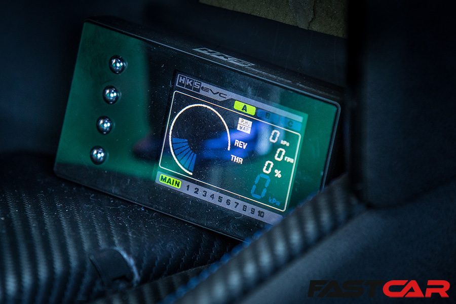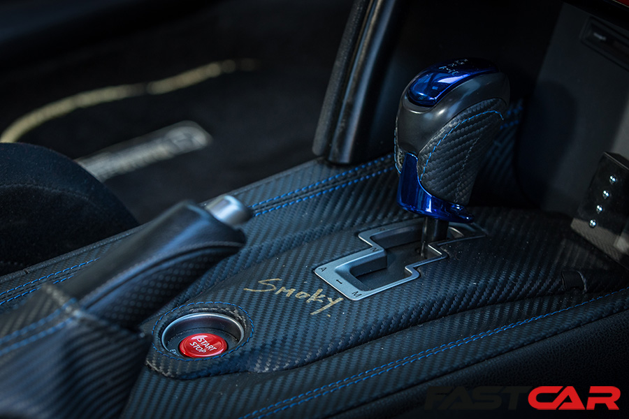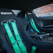 Considering the no-nonsense savagery of this car’s internal workings, the cabin is surprisingly sensible. It’s not stripped out as you may expect. There’s no roll cage, the back seats still remain, and it even has carpets! Although, maybe ‘normal’ isn’t the best way to describe it. Bride seats, Takata harnesses, a Top Secret steering wheel and lashings of custom carbon dominate the interior‘s visuals. Nevertheless, it has a real cosy cockpit feel. You get the impression it would be a comfortable, relaxing place to be while soaring past the 200mph barrier, as you do.