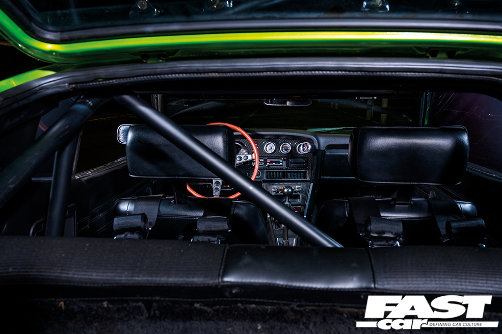 6-point chromoly rollcage, low-mounted bucket seats with harnesses, full Speed Hut gauge set, wideband gauge, carbon fibre dash panel and centre console