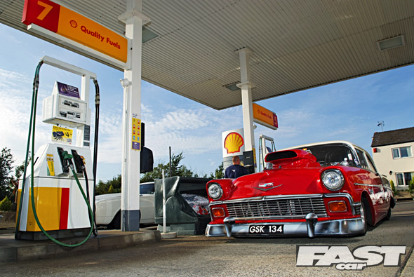 rear wheel tubs and the custom carbon-fibre dash by ARRC/DRE; ‘Dakota Digital’ Speedo bezel by ARRC with reproduction radio cassette by Classic Chevy International; all other vital functions for oil temperature, transmission oil temperature and rev counter all by Autometer; ARRC aluminium seats covered by Neil Tadman ’56’ seat covers – an anniversary gift from Ann-Marie! Black carpet foot-well mats by ARRC; Original headlining and interior courtesy light.