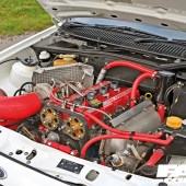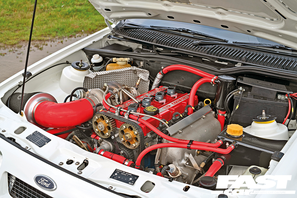 1993cc Cosworth YB built by Harvey Gibbs, 200 block, six long studs, stock crank, +0.25 Cosworth pistons, 7.9:1 compression ratio, Mahle race-spec main and big end bearings, Cosworth high-pressure oil pump, big-wing sump, WRC head gasket, Nick Waples ported cylinder head, Newman BD14 and BD16 cams with double valve springs, vernier pulleys, Hart inlet manifold, custom stainless tubular exhaust manifold, BorgWarner 70/64 twin-scroll turbo, Pro Alloy 63mm intercooler with twin fans, full custom hose set, Turbosmart recirculating valve, Link Fury ECU with wideband lambda control, fuel and oil pressure monitoring, knock control and oil temp, Anembo fuel rail with Bosch 1000cc multi-hole injectors, coil-on-plug, turbo speed sensor