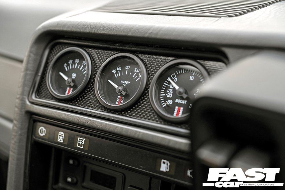 Original RS Cosworth trim, Stack gauges (boost pressure, oil pressure, coolant temp), carbon fibre gauge surround, Toucan touch-screen display with switchable maps