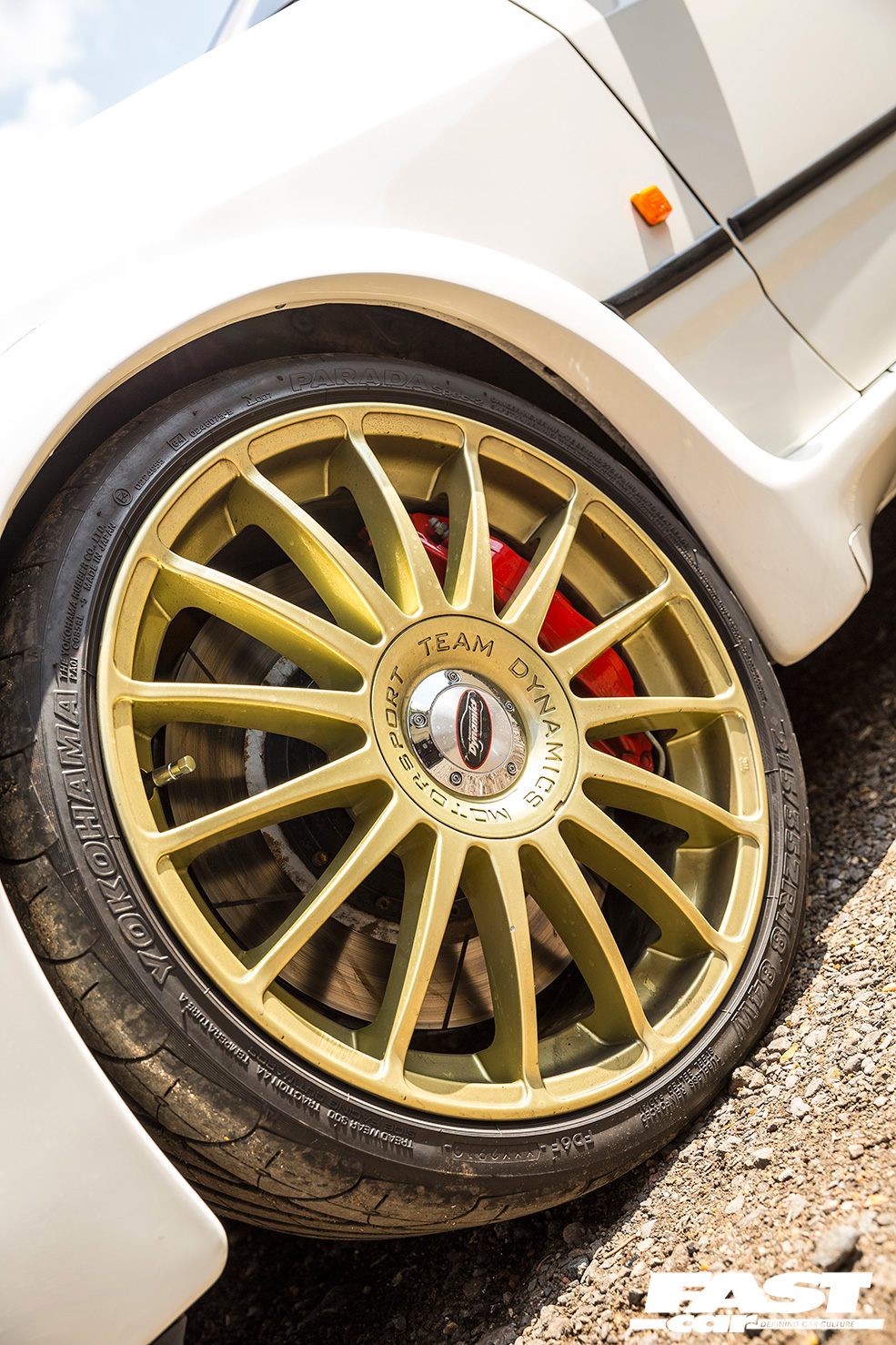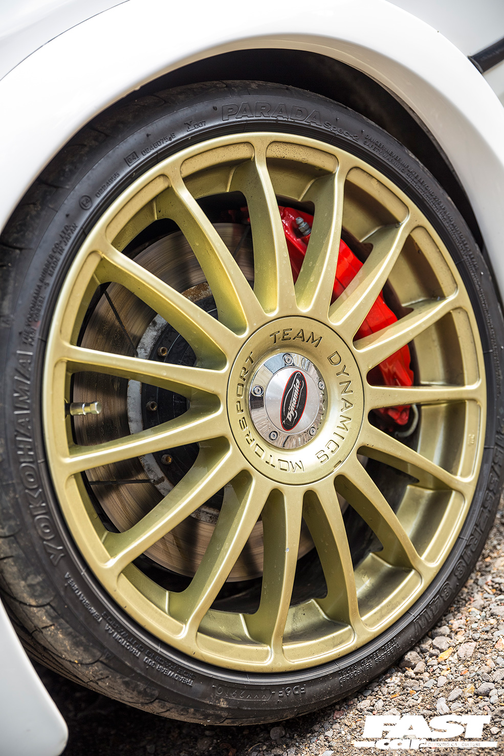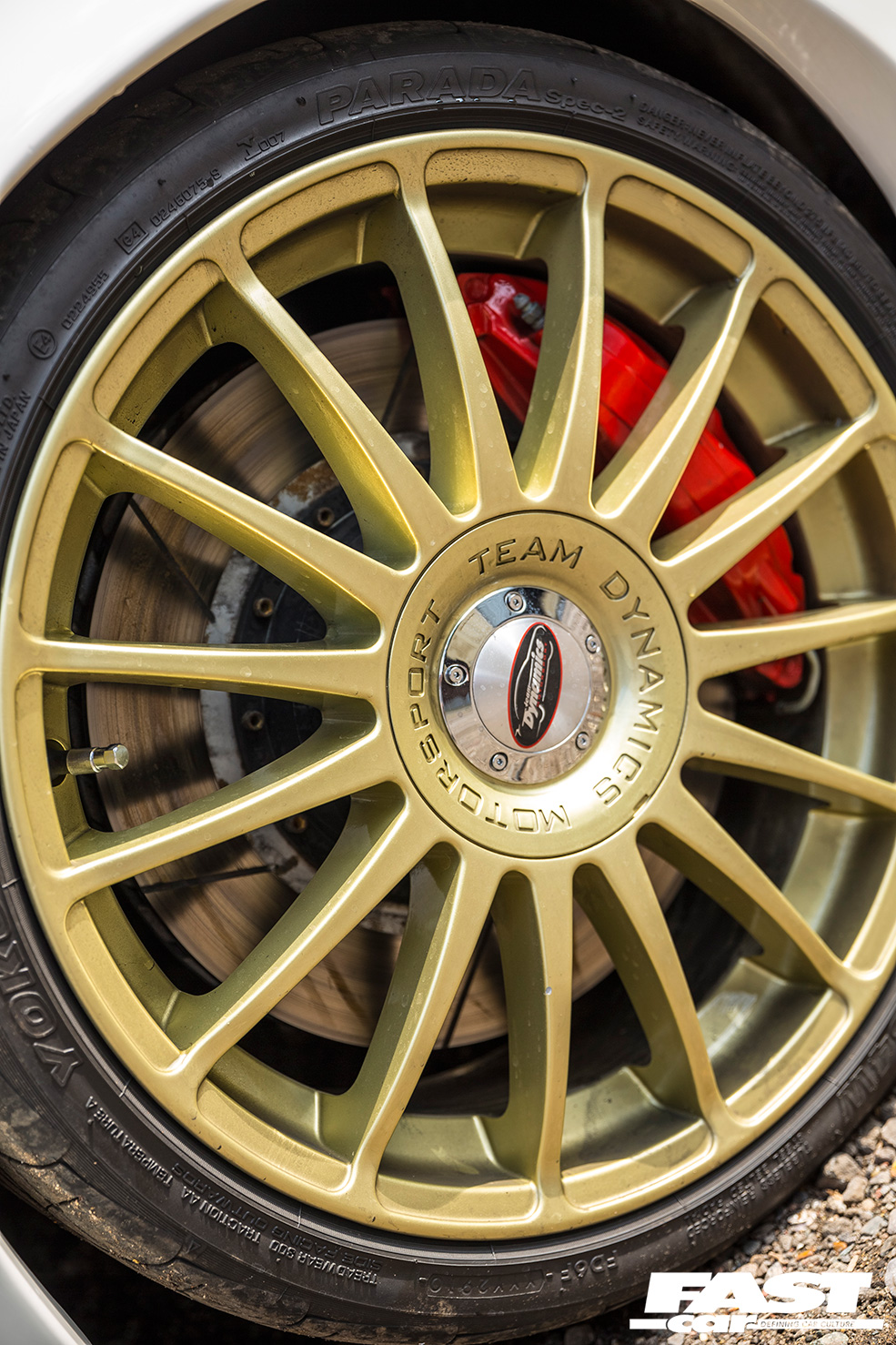 7x18inch Team Dynamics multi-spokes painted gold, Yokohama Parada Spec 2 215/35R18 tyres.