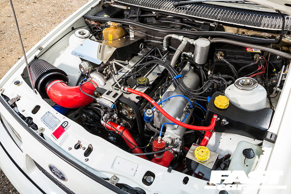1993cc YB Cosworth, 200 block, long studded, Mahle oversized forged pistons, forged connecting rods, Mocal remote oil cooler, ported and polished cylinder head, WRC head gasket, uprated valve springs and retainers, BD camshaft profiles, machined cam cover with text deletion, OddKidd Creations custom wiring loom, P8 ECU with custom map, twin air injectors, 1000cc fuel injectors, Bosch 044 fuel pump, Weber fuel pressure regulator, high-flow fuel rail, K&N cone air filter, Auto Specialists inlet manifold, GT3570 turbocharger, CR Engineering actuator, turbo brace, polished turbo heat shield, Bailey dump valve, RS500 intercooler, Airtec alloy radiator, anti-lag, wasted spark conversion, uprated 8mm ignition leads, Samco silicone hoses, 2WD Sapphire Cosworth exhaust manifold, 3-inch stainless steel exhaust system, polished fluid reservoirs.