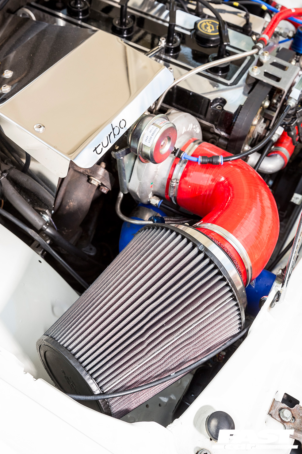 Those all-important diagnostics are flowing freely following the installation of the OddKidd-tweaked YB. An Airtec alloy radiator, an RS500 intercooler, Samco silicone hoses and an unusual cam cover that has been machined flat (in order to achieve a full text deletion) are also now in place beneath the great white Cosworth’s bonnet.