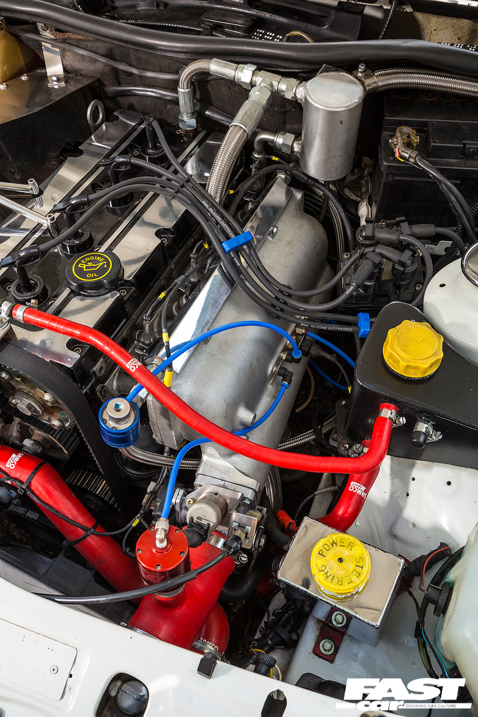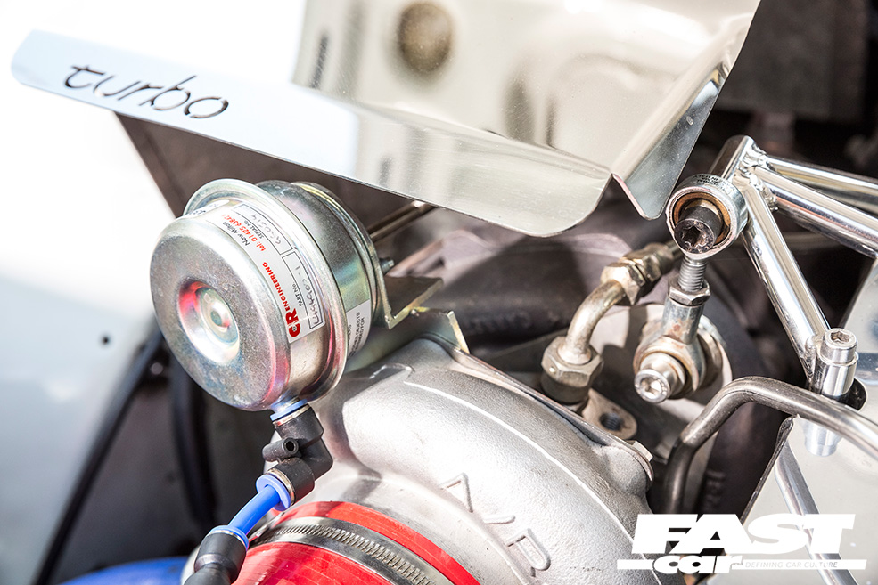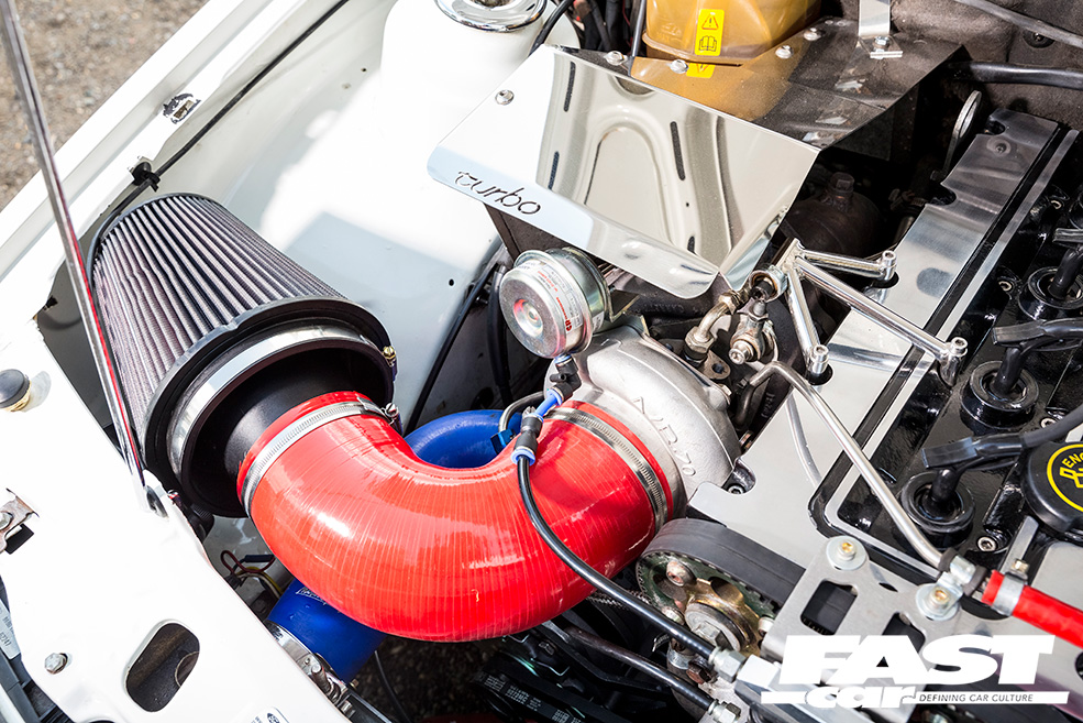 A strip and reassembly of the troubled YB followed, with new 1000cc fuel injectors, fast road camshafts, a WRC head gasket, an uprated valvetrain and a replacement wiring loom thrown into the mix. Twin air injectors, a braced GT3570 turbocharger and a P8 ECU with a custom map worked wonders in releasing stifled ponies, while airflow improvements came in the form of an Auto Specialists inlet manifold, a 2WD Sapphire Cosworth exhaust manifold and a three-inch stainless steel exhaust system.