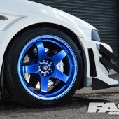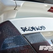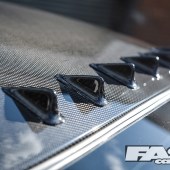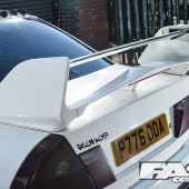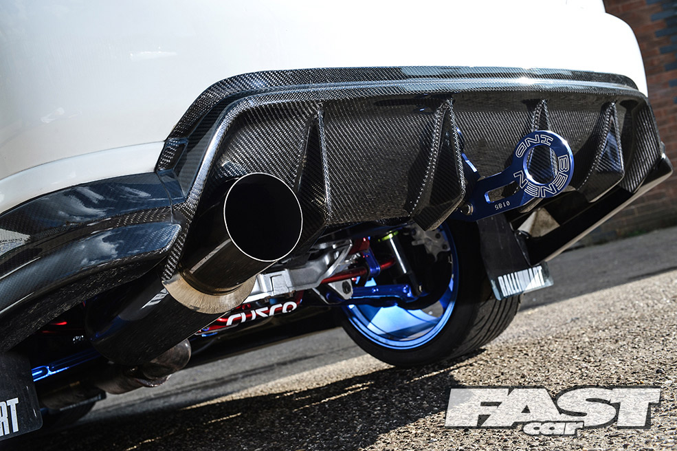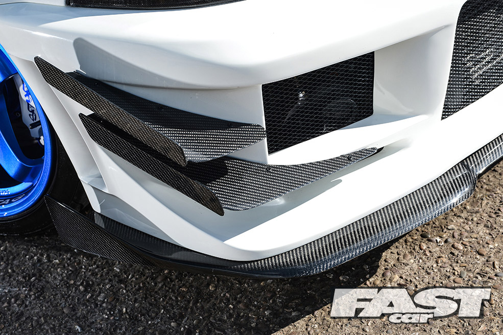 Rukus Customs carbonfibre bonnet, one-piece H.I.D headlights, JUN front bumper with custom carbonfibre splitter and canards, Veilside door mirrors, wind deflectors, carbonfibre roof skin with custom vortex fins, 25mm wider wings all round, carbonfibre sideskirts, carbonfibre rear spoiler blade, carbonfibre rear diffuser