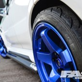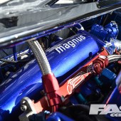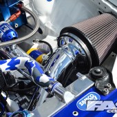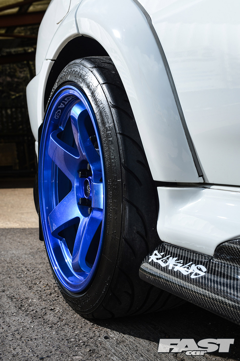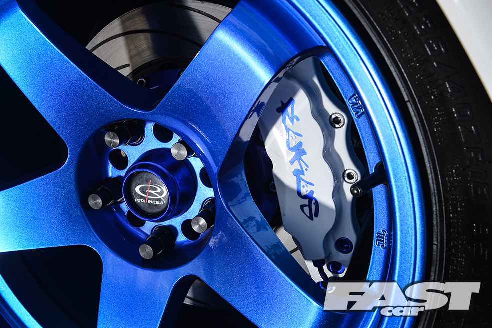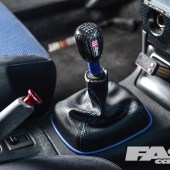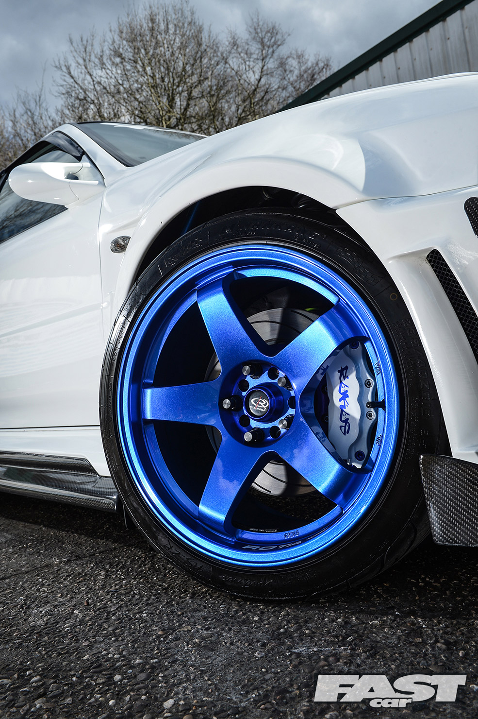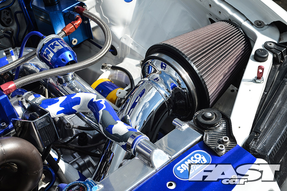 Talking of different, have you seen the coolant hoses? Craig wanted something unusual to go with the blue and white theme, so Mark Hale from Samco Sport hooked him up with some custom camo coolant and power steering hoses. The engine bay is a work of art. The engine itself looks amazing, from the painted Magnus inlet manifold to the chunky Cusco strut brace it all works. It’s what isn’t there that really makes the difference though.