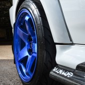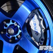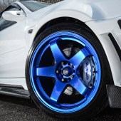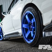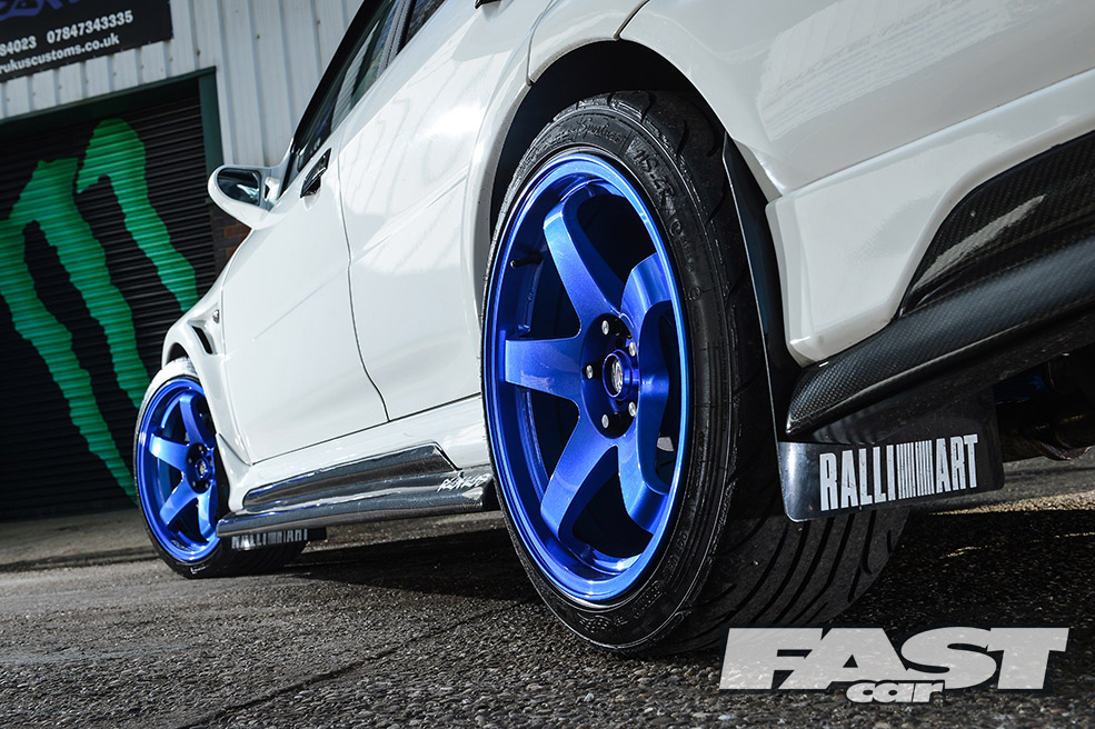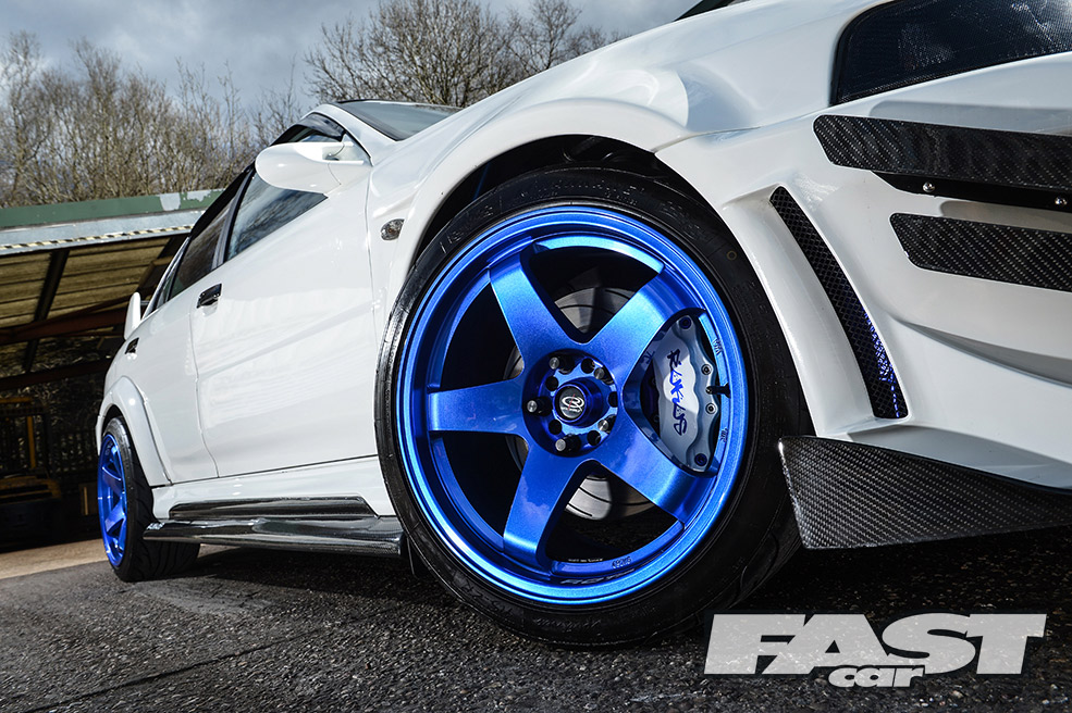 9.5x18in Rota GTR wheels custom coated by Rukus Customs, Full Evo VI running gear conversion and wider chassis, RS plate-type differentials front and rear, RS steering rack, HSD Monopro coilover suspension, Cusco front and rear anti-roll bars, Cusco front 3-point strut brace, Cusco rear 3-point strut brace, D2 8-pot calipers and discs with Carbotech XP8 pads, Battery relocated to boot