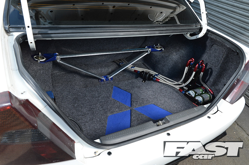 2.4-litre forged engine built by AP Tuning on a 4G64 block, MoTeC M800 ECU, Ross Sport GT37HTA turbo. Wiseco HD pistons, I-beam con-rods, balance shaft removed from crankshaft, CNC ported cylinder head with oversize valves, JUN cams, HKS Vernier pulleys, Magnus race inlet manifold, S90 throttle body, AMS fuel rail, Injector Dynamics 1,600cc fuel injectors, Radium swirl pot with twin Bosch 044 fuel pumps, Walbro in-tank fuel pump, SARD fuel pressure regulator, JMF exhaust manifold and elbow, Precision 38mm external wastegate, custom 3in straight-through stainless-steel exhaust, HKS intake pipe with K&N air filter, Pace front-mounted intercooler with Ross Sport hard pipe kit, Spark Tech coil-on-plug CDI kit, HKS timing belt, Koyo alloy radiator with carbon brackets and Mishimoto slimline fan, HKS blow-off valve, Setrab 19-row oil cooler, Mocal oil catch tank, various Spec-R tanks and covers, Evo VII engine cover, custom Samco coolant and power steering hoses, Extreme alloy slam panel, Gizmo boost controller, polybush engine mounts, Exedy HD twin-plate clutch