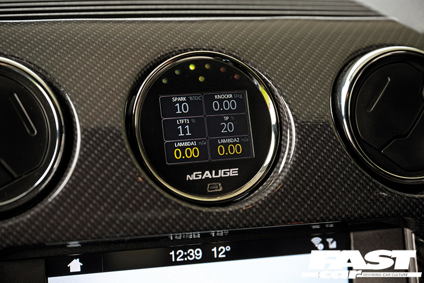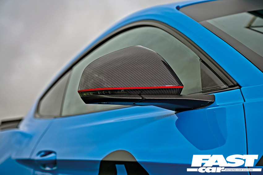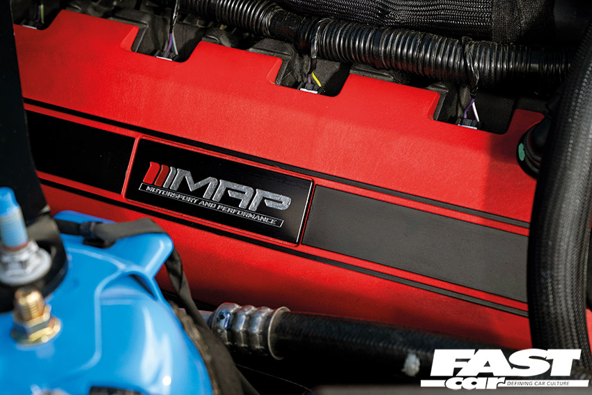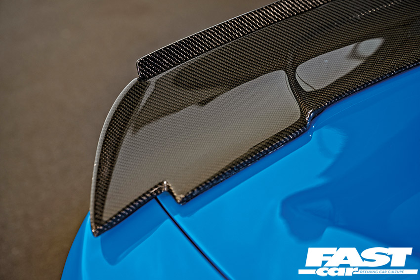 He says, “The inside is a nice place to be but I did change the original seats for some Corbeau items for the extra support and I wanted the red seat belts. Plus I added some carbon fibre and Alcantara trim to complete the look.”