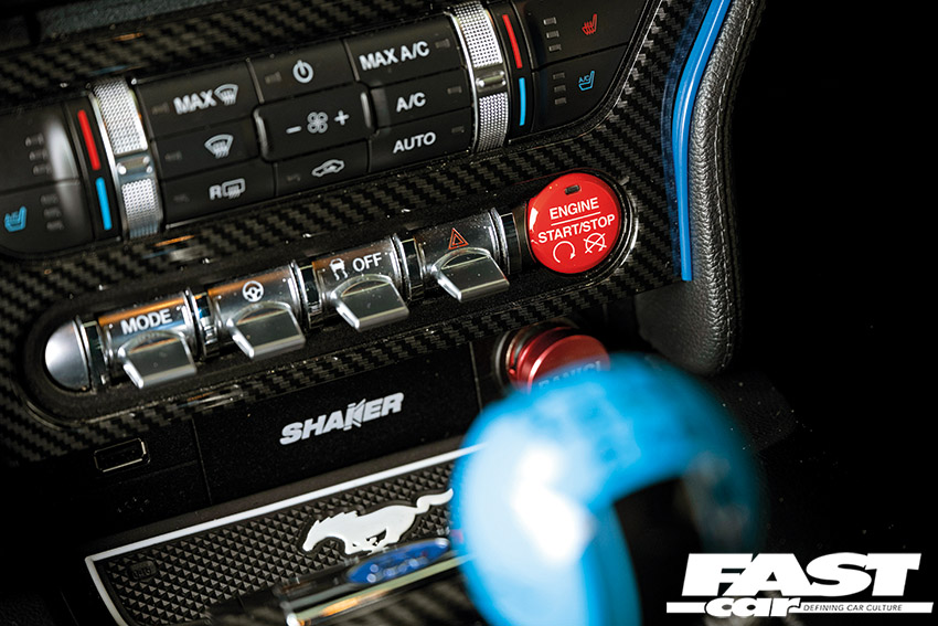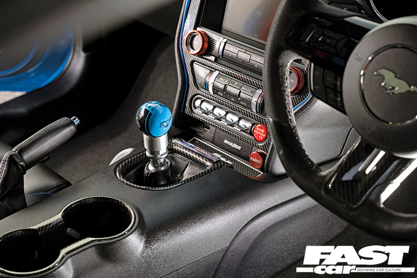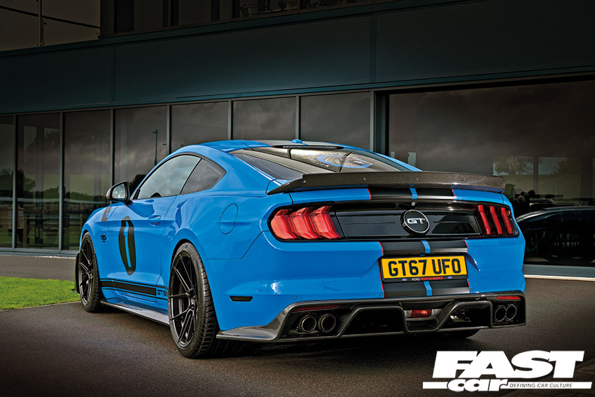 Mustang GT Shadow Edition in Grabber Blue, MP Concepts GT500 front bumper with additional APR Performance carbon fibre splitter with supports, Roush Performance bonnet scoop, custom sun strip, Anderson Composites carbon extended side sills, carbon-wrapped mirrors, Anderson Composites carbon fibre rear spoiler, custom GT850 decals, Anderson Composites GT350 rear diffuser, tinted glass, wrapped indicators, MP Concepts smoked front indicators