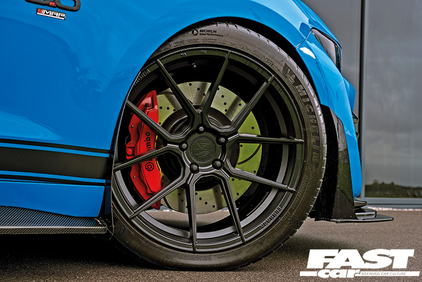 Front: Mustang GT Brembo six-pot callipers with 380mm EBC drilled discs and EBC Yellowstuff pads; rear: Mustang GT callipers with 330mm EBC drilled discs and EBC Yellowstuff pads