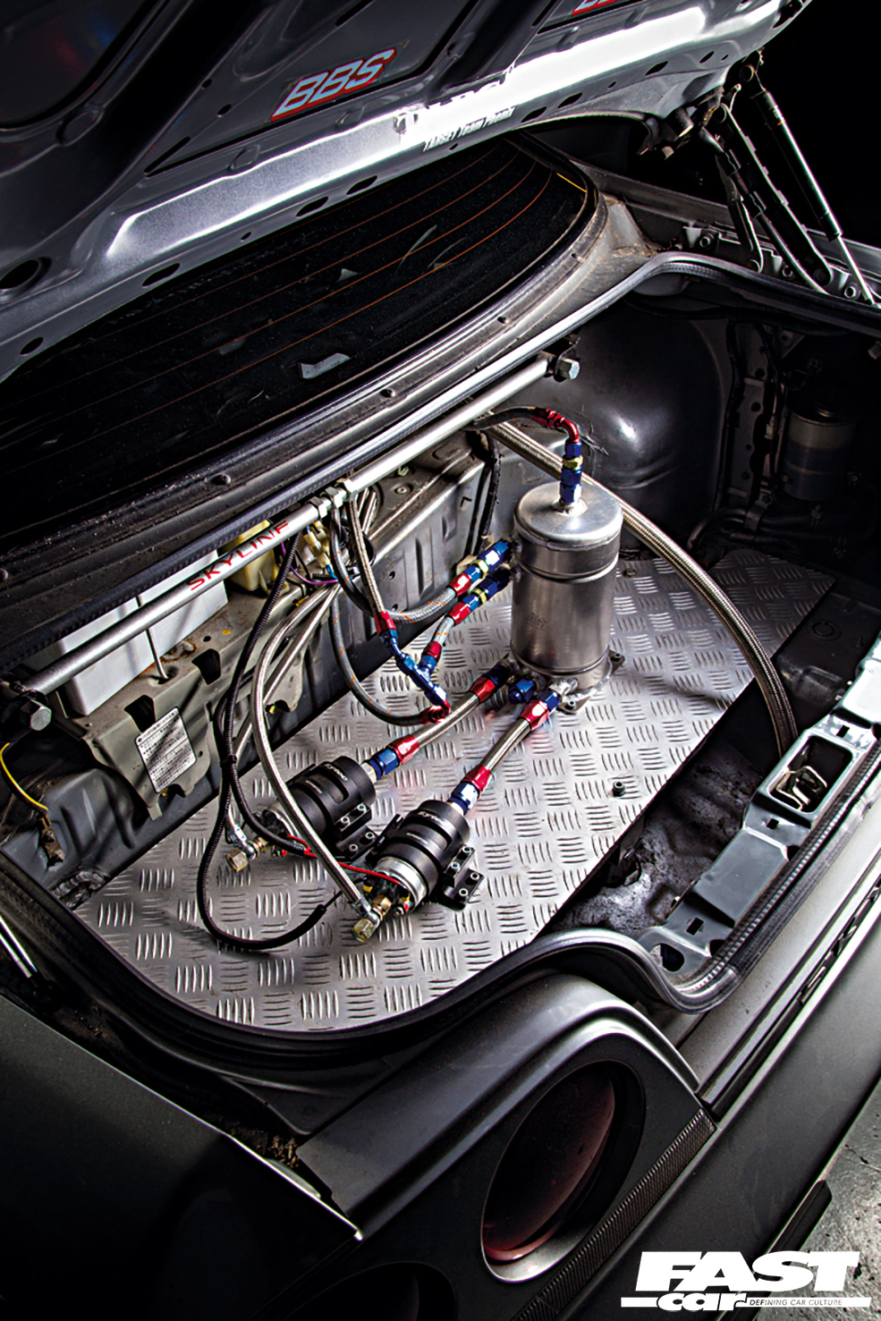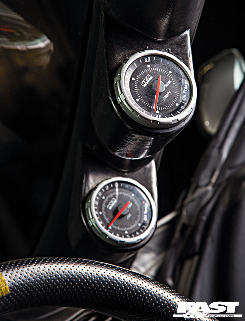 As Alex turns the ignition an array of noises kick into life which could mean two things; is it about to unleash hell, or blow up into pieces? Two Bosch 044 pumps fill the cabin with the smell of V Power, fuelling the 2.7-litre motor with enough juice to crank it over. A few seconds later and the RB26 erupts with a grumble, barely able to idle thanks to the HKS Step 2 camshafts which shift the power band right upto the good side of 9000rpm.