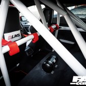 Braum Racing Elite-X seats and stock door cards with custom retrim by Top Stitch Upholstery, Rear seats removed, Hyper Sport Engineering custom roll cage, OMP racing harnesses, OMP fire suppression system