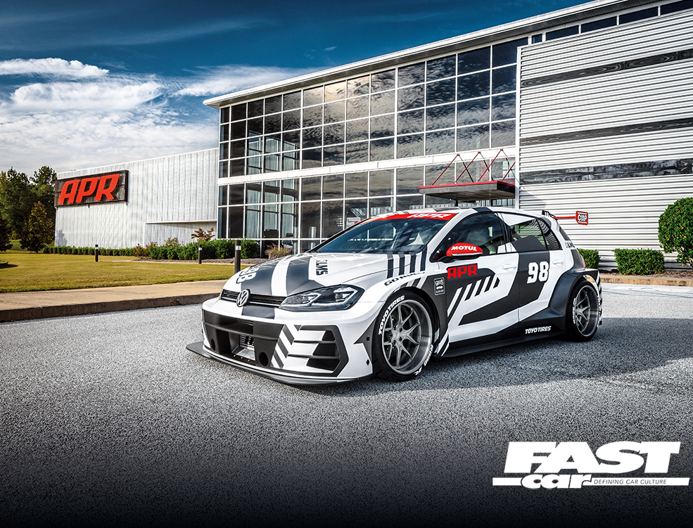 While the shell was bulked up and moved from state to state, APR’s team back in Alabama got to grips with the centrepiece of the build. The core of which is a blueprinted crate engine, slightly overbored from 1984cc to 2008cc, balanced and built to the finest motorsport-ready tolerances with money-no-object high-performance forged components, all engineered to cope with the company’s lairiest turbo setup yet. The TSI uses a twin-scroll, 71mm BorgWarner turbo, fed by a large carbon fibre intake and paired with an equally generously-proportioned APR intercooler crammed in behind the bumper. It’s a drop-in setup, controlled by a Stage III ECU and with its thirst for premium-grade dinosaur bones, supplied by high-flow pumps and injectors.
