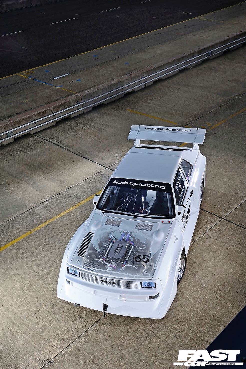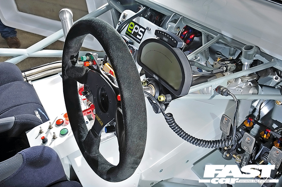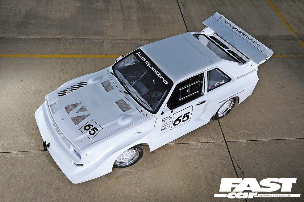 Of course, on the outside at least, all the ‘period correct’ details are there. The carbon-Kevlar body panels that Dave crafted himself with the help of Dailynx, who have many of the original moulds. The wide arches, huge rear ring wing and deep front air dam, all bolted on to one of the most comprehensive space frames we’ve ever clapped eyes on. There’s even the completely crazy, not to mention totally anal, stuff like the 11-inch shorter wheelbase over the standard Quattro and a windscreen with a more ‘swept-back’ angle for less distracting reflections. In fact, Dave bought a pretty mint donor ’80s Quattro road car to start off with and ended up using nothing more than the wiper panel and inner-guard!