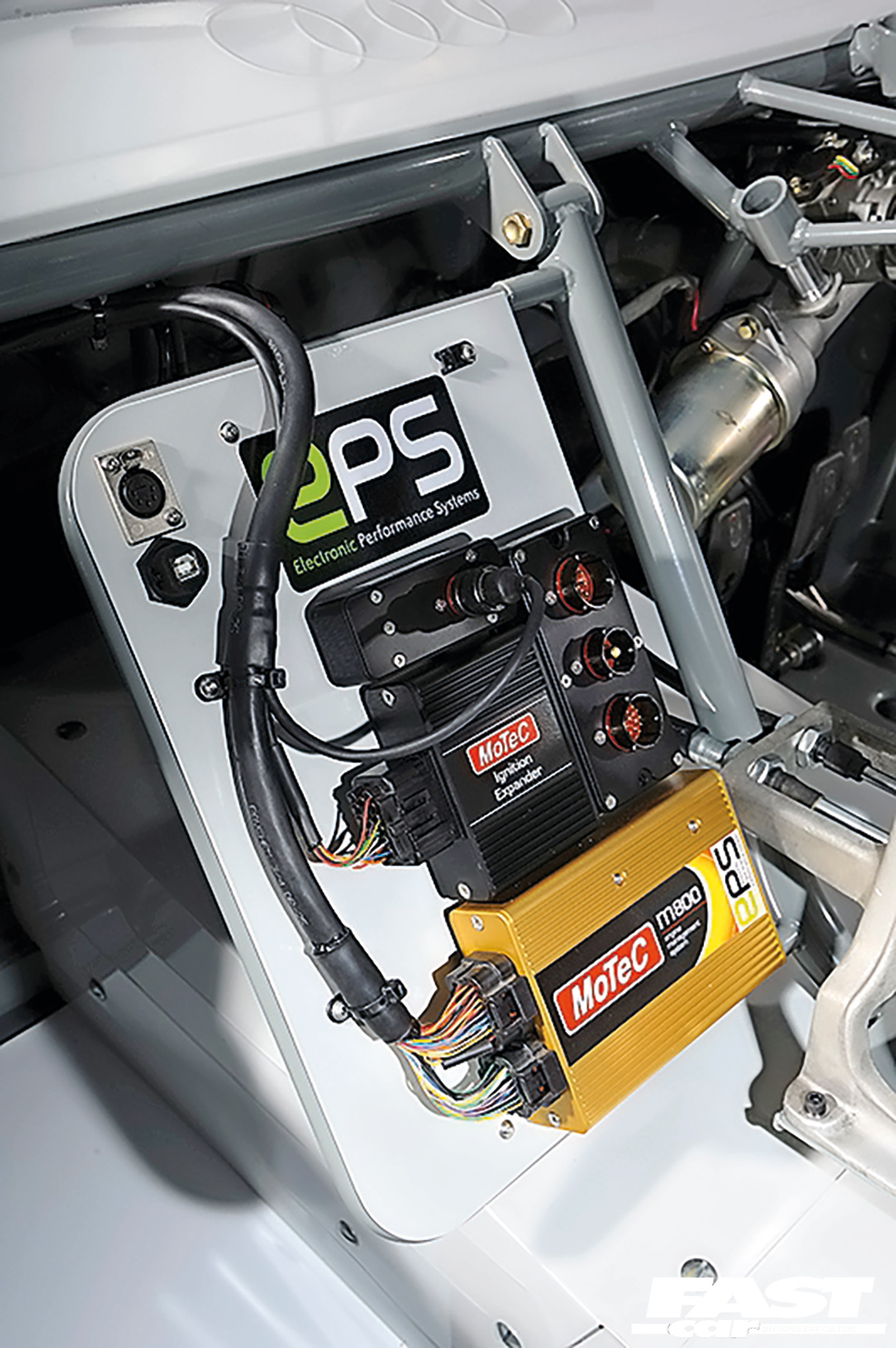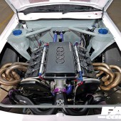 3.65-litre Audi V8 PT engine, secret spec twin Garret turbos, steel liners fitted, custom head stud kit, JE Pistons 11.5 compression, Total seal rings, 034 motorsport rods, heavy duty engine bearings, Peterson 3 stage dry sump system and 3 gallon oil tank, Ric Wood CNC ported heads, shimless cam followers, Ferra oversize valves, heavy duty springs, custom intake manifold with 18 Injectors, 85mm electronic throttle, 321 stainless exhaust manifolds, titanium alloy 3-inch exhaust with Burns stainless side exit boxes, ASNU motorsport 1100cc injectors, 2000hp fuel pump, Aeromotive fuel pressure reg, EPS Motorsport 19mm fuel rails, MoTeC ADL3 Back Lit Dash Logger, M800 ECU and PDM, SKM closed loop knock control, 10Hz GPS, Radair speed sensor based traction control, DR25 Raychem looms with Type 55 wire, electronic power steering with ECU controlled speed sensitivity, 20hz GPS. PAR 6-speed close-ratio dog box, 4.1kg flywheel, Tilton 3-plate clutch, Tilton 800 series hydraulic release bearing, Gripper front, centre and rear diffs, GKN CV joints with gun drilled hollow drive shafts, custom gear leaver assembly with strain gauge fitted for full throttle shifts and auto throttle blipping on down changes, rear mounted radiator, Dry Brake fittings to pre-heat the engine, Brembo 4-pot calipers front and rear, Brembo full floating vented discs, Tilton floor-mounted pedal box, performance friction pads, brake rotor temps and brake pressure logged front and rear
