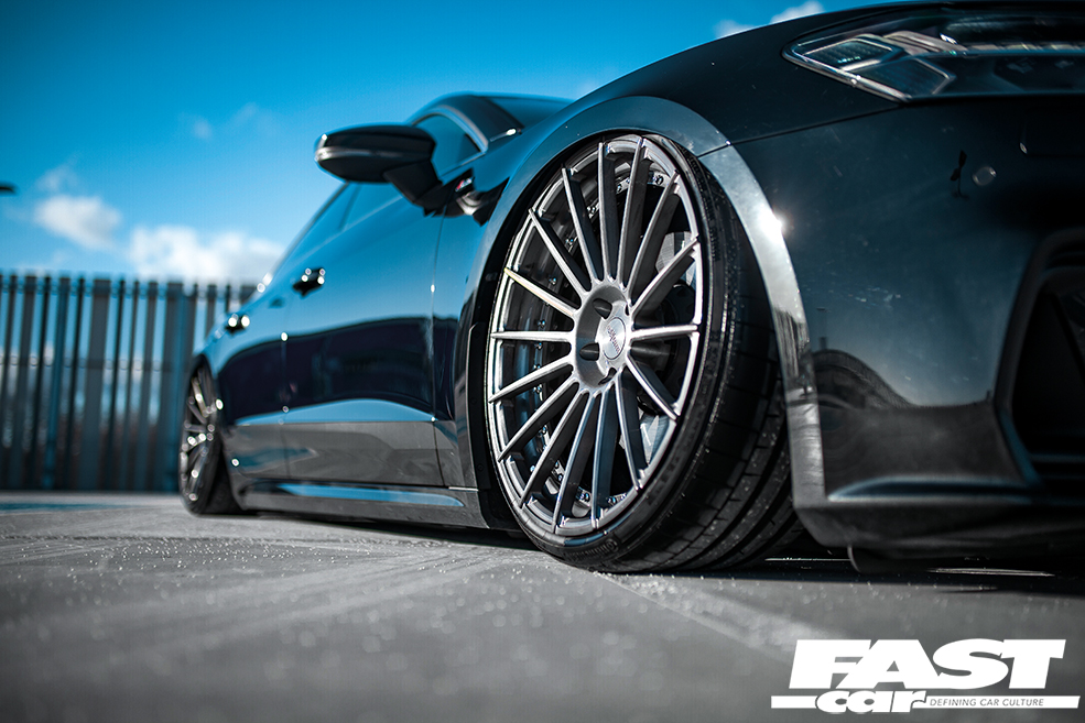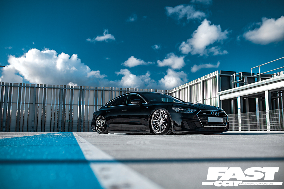“The air-ride was fitted by one of our dealers – James at GRM Northampton,” Matt explains. It’s a pukka Air Lift setup, and the fact that the contemporary VAG platforms are so well served by the Air Lift range means that the fitment was a breeze and everything works magnificently with the OE chassis setup. 3P management is a sensible choice here too, offering as it does a fully integrated manifold, five custom presets, rise-on-start, show mode, and the nifty Air Lift Performance 3 controller. And of course, when you’ve bagged a boxfresh ride, you can’t just leave it on the stock rims, it’ll look unfinished. But fear not, Matt had a gameplan here from the start: “We’d previously worked with Rotiform to build a Golf R for the 2019 SEMA show,” he says, “so when we built this A7 it was always the plan to get Rotiform involved to create the wheels for it.” The result is a masterclass in tasteful elegance with a simmering undercurrent of brutality, the SRG Mono 2 wheels measuring a robust 10.5×21-inches all round. Seeing large-diameter multispoke wheels tucked deep into the arches of an Audi can’t help but call to mind images of 1990s A4 BTCC racers, and yet at the same time the classiness of the design works beautifully with the gently flowing body lines of the A7.