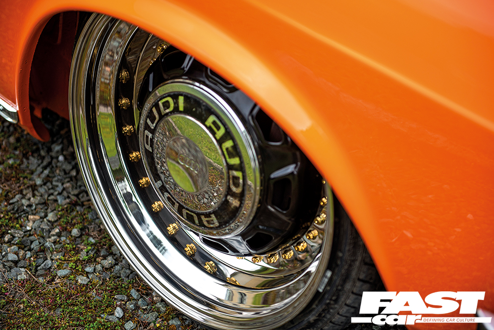 9×17” custom 3-piece split-rims with stock Audi centres and caps and polished lips, 185/35 Nankang tyres, custom air-ride system, stock brakes