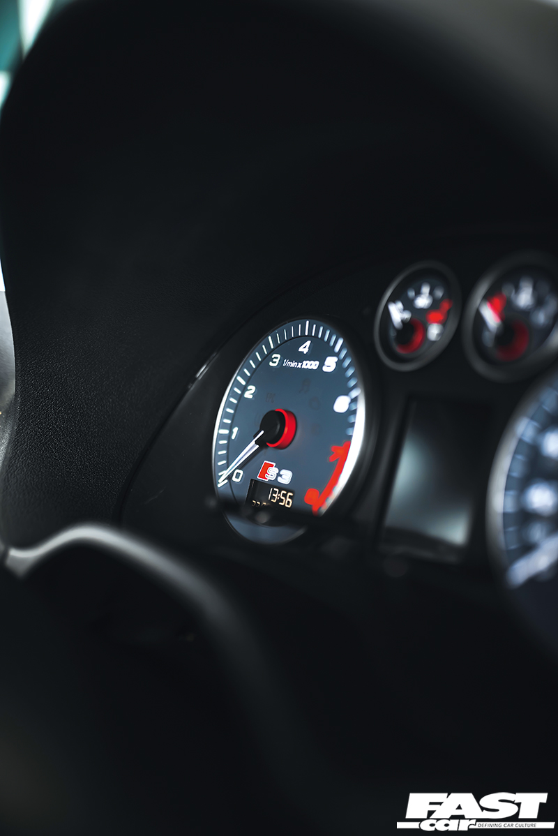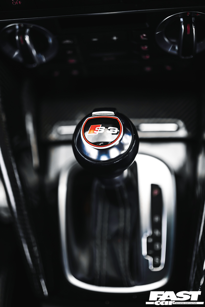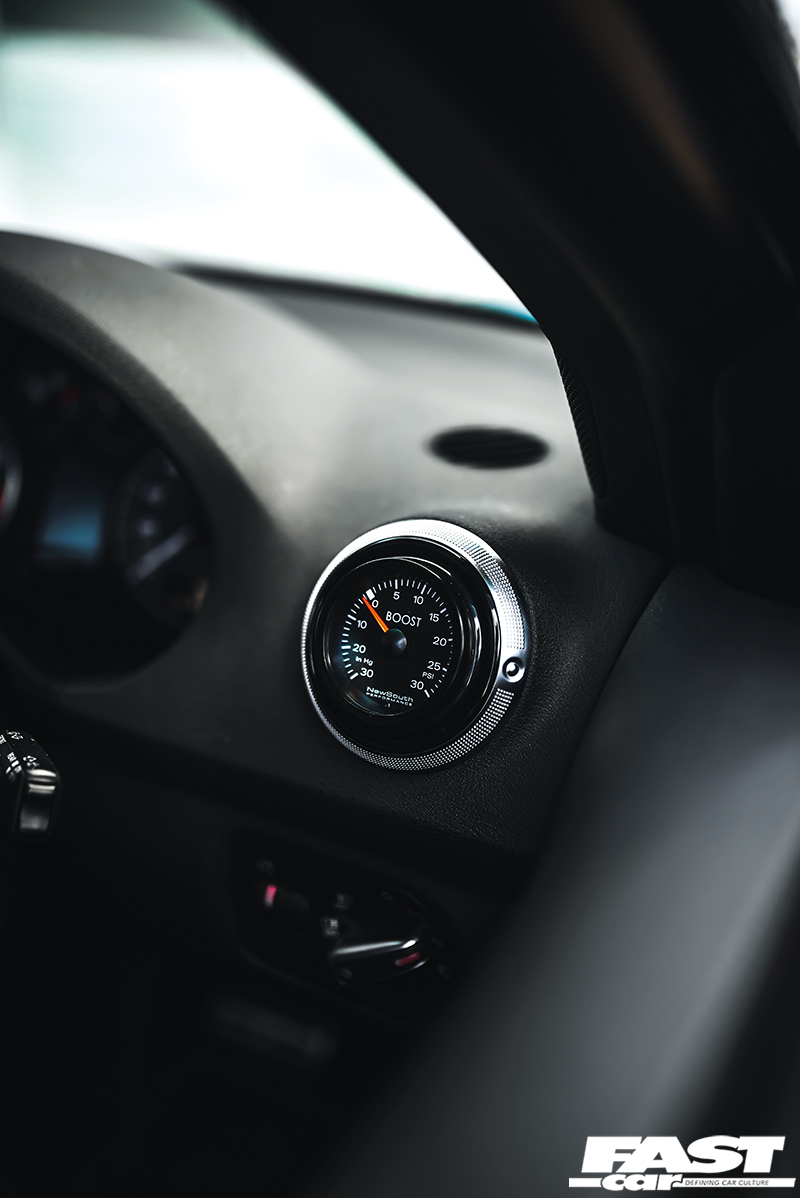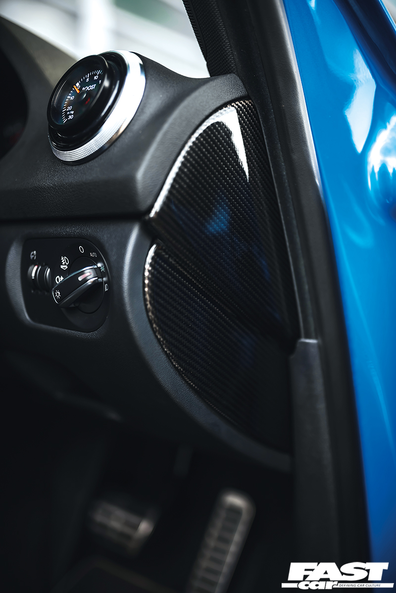 Visually, the bagged Audi S3 also had the advantage of the Audi parts bin, and some desirable OEM+ upgrades to choose from. Phil tracked down a pair of RS3 wingback Recaros in the same black leather as the under-bolstered factory S3 seats, then swapped out every piece of dashboard trim for carbon fibre, matched to the spokes of its RS6 steering wheel. The APR transmission map shows a little extra useful information in the instrument cluster, while the vent-mounted boost gauge is positioned for quick glances without looking like a garish afterthought against Audi’s muted cabin design.