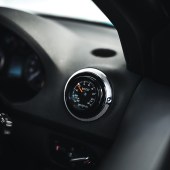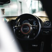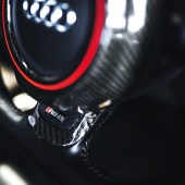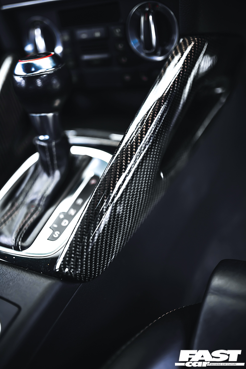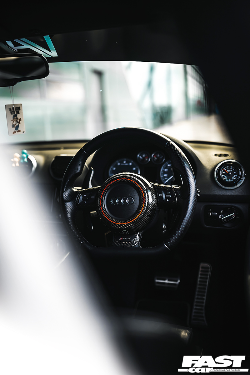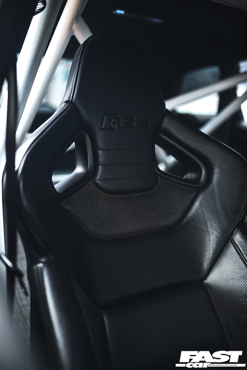 Visually, the bagged Audi S3 also had the advantage of the Audi parts bin, and some desirable OEM+ upgrades to choose from. Phil tracked down a pair of RS3 wingback Recaros in the same black leather as the under-bolstered factory S3 seats, then swapped out every piece of dashboard trim for carbon fibre, matched to the spokes of its RS6 steering wheel. The APR transmission map shows a little extra useful information in the instrument cluster, while the vent-mounted boost gauge is positioned for quick glances without looking like a garish afterthought against Audi’s muted cabin design.