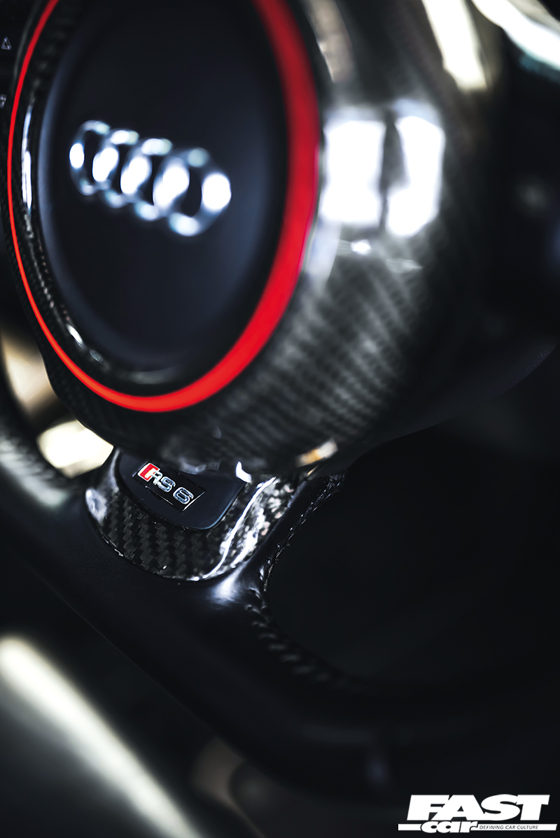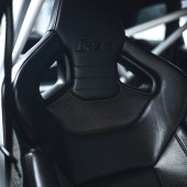 Custom RS3 ‘wingback’ Recaro seats, custom C7 RS6 steering wheel, carbon centre console grab handles, carbon fibre dashboard trim and end caps, custom boot build and rear seat delete, custom roll cage (painted white), NewSouth Performance boost gauge
