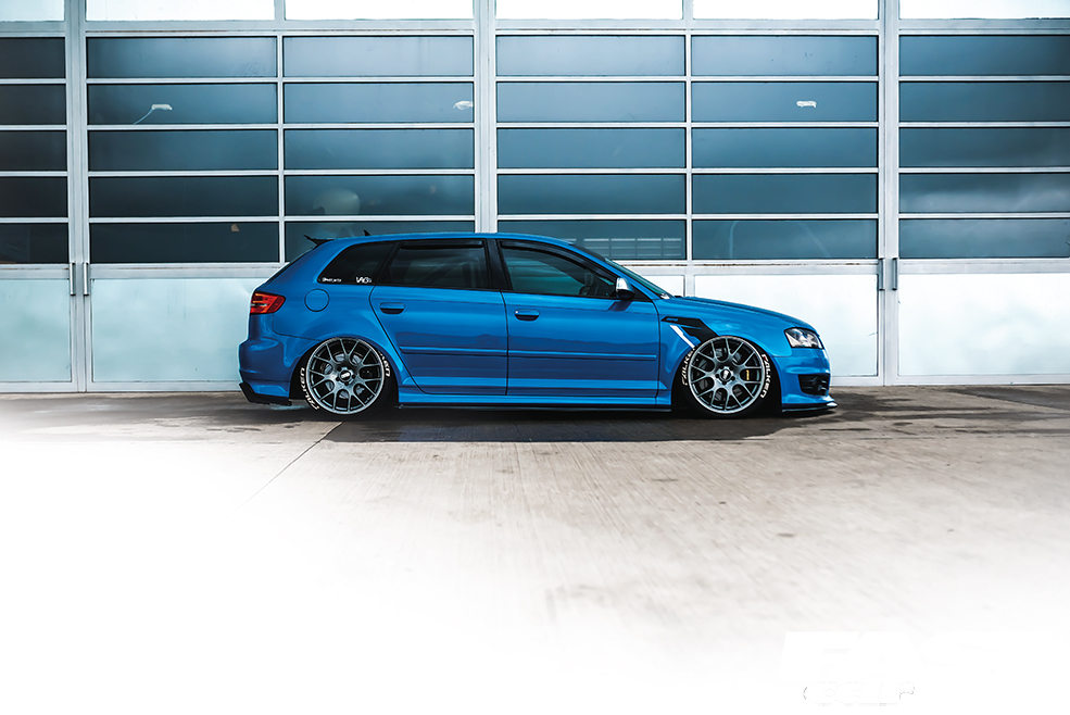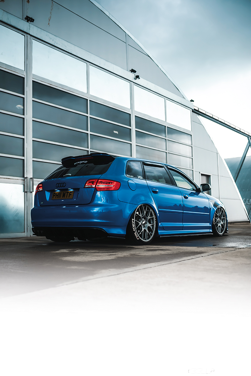 Changes had come quickly enough to propel the S3 from a stock weekend car to a spiralling high-performance daily driver within a year, but Phil had no plans to slow down. Still a regular at shows, he stumbled across Stuart Davis’s home-built 8P S3 at Ultimate Stance – an aired-out, sprint blue five-door, with Bentley leather and a stance no coilovers could deliver. Stopped in his tracks, it was the seed of a new set of ideas – beginning with the urgent need for less ground clearance.