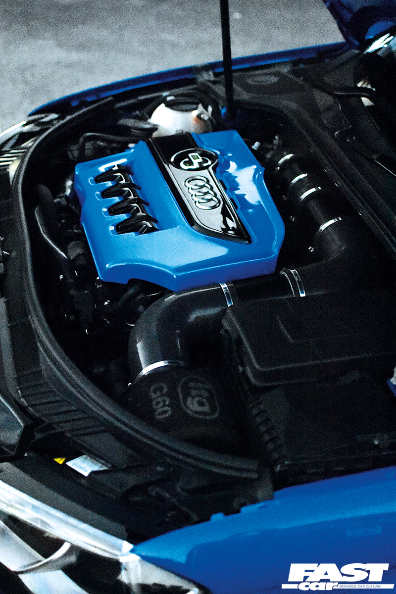 1984cc four-cylinder turbocharged petrol (CDL), APR Stage 2+ with transmission control unit (TCU) upgrade, ITG induction kit, APR race front-mount intercooler, Milltek 3in turbo-back exhaust (non-resonated), Trackslag 3.5in downpipe, APR runner flap delete, Loba Motorsport high pressure fuel pump, RS4 fuel return valve, R8 coil packs, iridium plugs, polyurethane engine and gearbox mounts