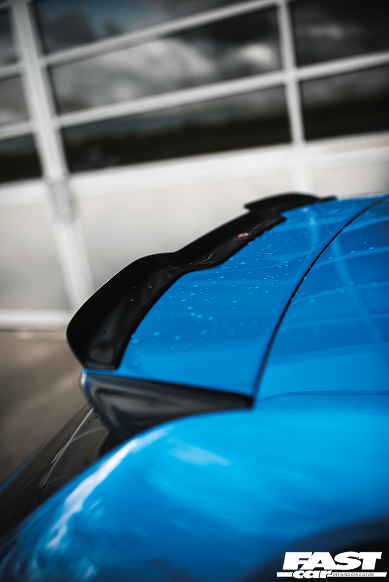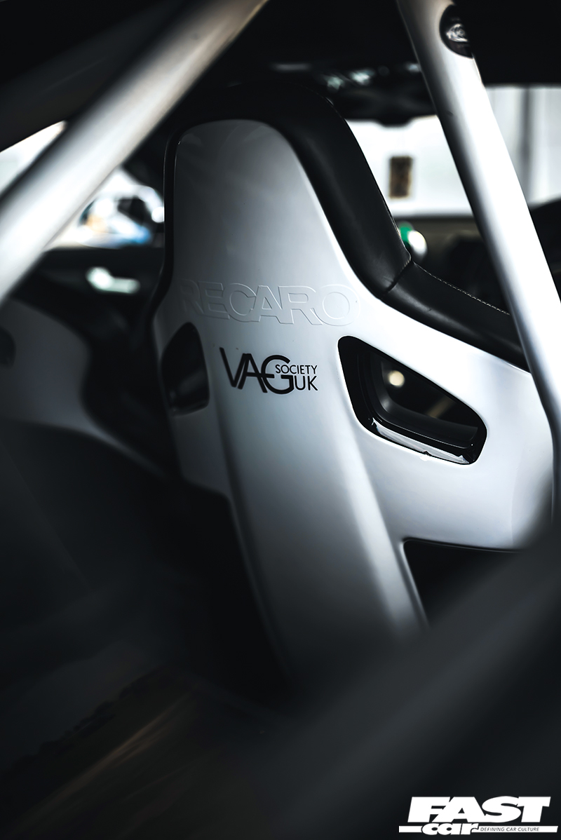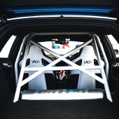 Not that the matching trim counts for much, given that the rear bench was retired as part of the same process. Pop open the rear doors and there’s a substantial half-cage colour-matched to the RS3 seatbacks, protecting the centrally-mounted air tank and associated hardware just in case it heads out on track again. It’s a hint of GTI Clubsport inspiration, but very much home grown.