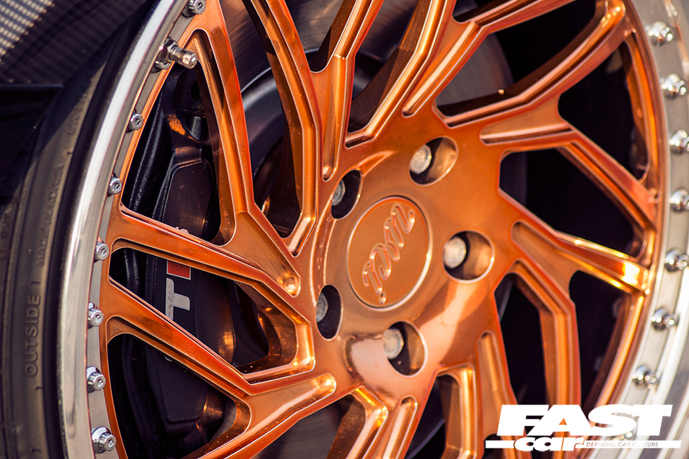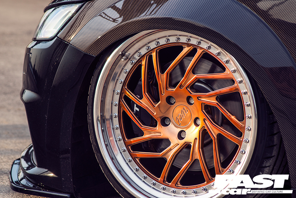 This startling aesthetic is helped along by the rims of course, that goes without saying. After much deliberation, Nick’s opted for a set of JB1s from WatercooledIND in a robust and no-messing 20” diameter, finished in an on-fire and on-fleek citrus hue to complement the fruity upholstery within. “It’s really hard choosing a set of wheels for a project,” he says (echoing the thoughts of every reader out there – the struggle is real). “You have so many ideas and you need to check everything out; this choice was made because you just don’t see these rims very often and I wanted the car to stand out. The finish isn’t a normal copper, it has a couple of other colours mixed in so they change in different light and at different angles.”