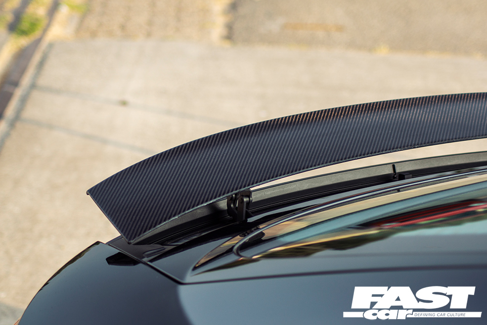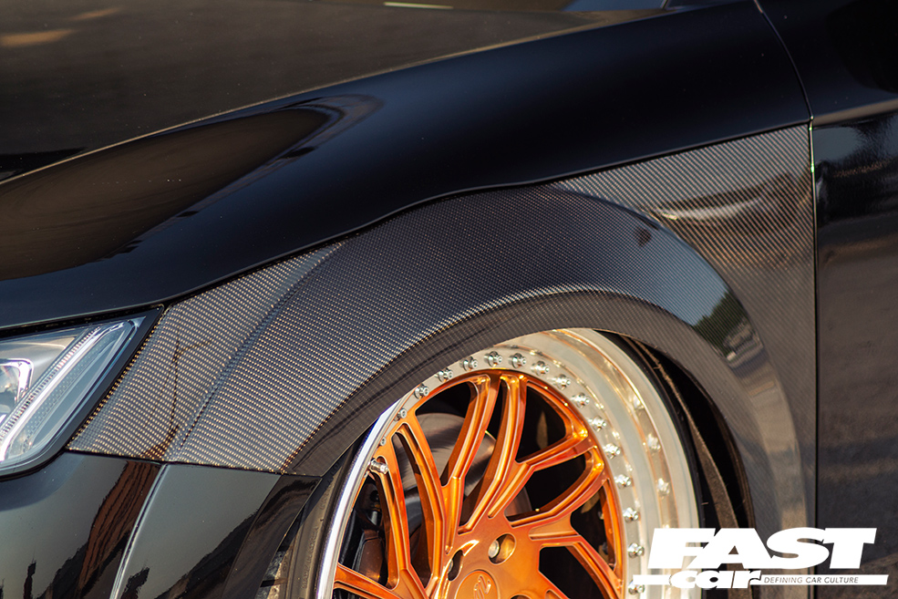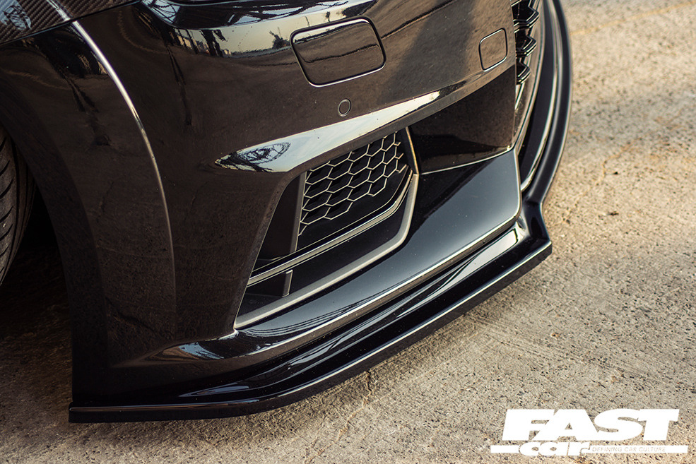 Mücke wide carbon fibre front wings, Xenonz/X-UK front grille, Rieger Tuning front lip, CarbonWurks mirrors, custom-made carbon rear spoiler and debadged carbon bootlid, gloss black diffuser