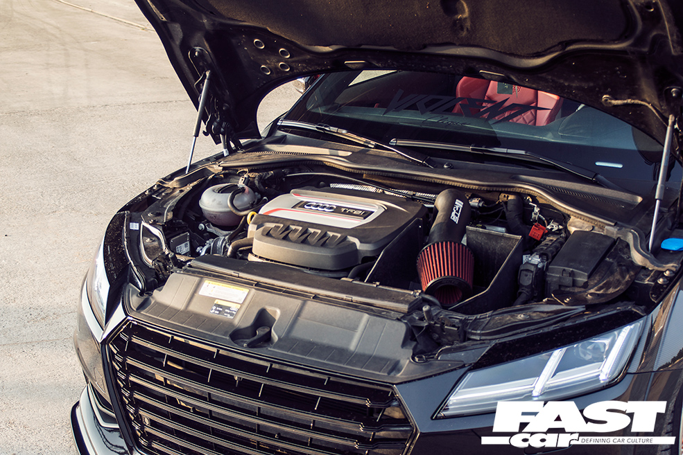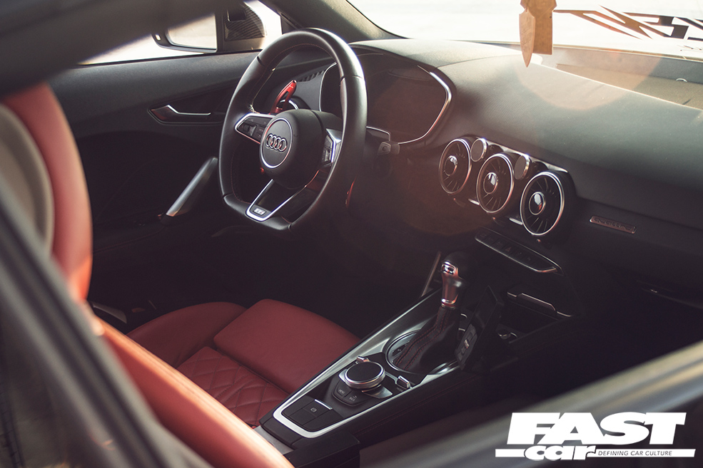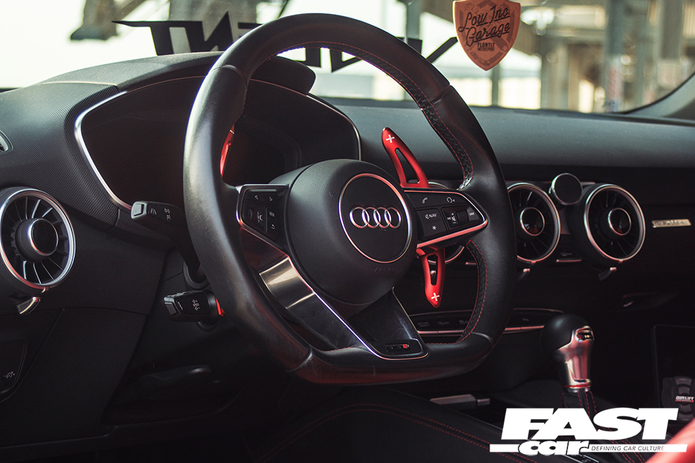 Now, you could never describe a rims-and-drop TTS as ‘all show and no go’, given how rapid they are in standard form. But you’ll also be gratified to learn that Nick’s project isn’t simply a rims-and-drop exercise; he’s worked hard to ensure that ‘go’ and ‘show’ are on a level pegging, and this is attributable in large part to the expertise of DVX Performance. These tuning eggheads were commissioned to jumble up the Audi’s brains, applying a custom mix of the Stage 2+ remap along with a sportier reflash of the DSG software to turn the TTS into something really quite devastating.