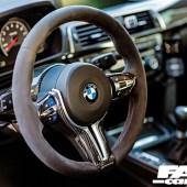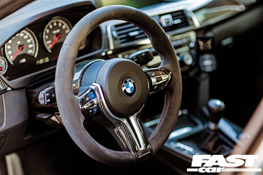 The front end sports a Dinmann carbon fibre lip paired with M Performance lower splitters, while the headlights are accented with Silicon Valley Bimmer carbon fibre eyelids. The stock front arches were removed and replaced with Dinmann’s full carbon fibre items which dominate the motorsport-inspired, high-end flavour. Carbon side blades from Morph Auto Design and the M Performance mirror caps combine to enhance the side profile. A 3D Design boot lid spoiler and Kohlenstoff carbon diffuser take up the rear gunner position, ensuring that the weaved wonder stuff theme flows from end to end. “I had a theme in mind with the exterior styling of the car. I knew I wanted to go with carbon fibre, and I really rate Dinmann’s quality and style,” Christian explains.