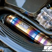 With an aggressive but classy exterior and an OEM+ interior, the engine bay is home to some more top-flight componentry, but Christian has opted for custom finishes that bring a sense of fun to the build. The bay is dressed up with Goldenwrench’s cap set, while the intakes and charge pipes were upgraded to titanium with a blue, gold, and purple zebra design by RK Titanium. “I chose these items because of the eye candy element and quality craftsmanship. Each piece is handmade, and the resulting amplification of the induction noise is addictive,” says Christian.