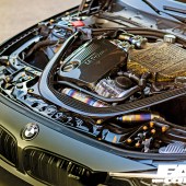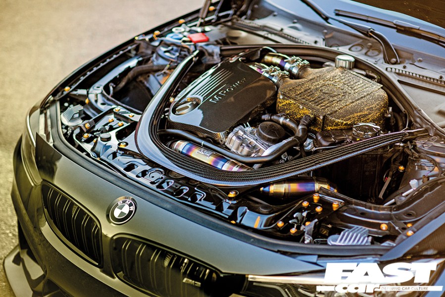 3.0-litre twin-turbo straight-six S55B30, RK Titanium charge pipes and front-mount intakes in custom Zebra Pattern 1, CSF uprated chargecooler in black with gold splatter, Blackline oil cap, Dinmann carbon fibre radiator cap and carbon fibre intercooler reservoir cap, AWE SwitchPath resonated exhaust, Mishimoto oil cooler, oil catch can and heat exchanger, VRSF downpipes, bootmod3 Stage 2 Tune, carbon fibre engine cover, Downstar engine bolts in gold. Six-speed manual gearbox